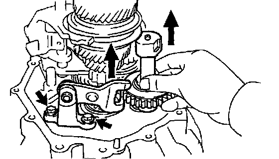 b. Remove the 2 bolts and pull off the reverse shift arm.