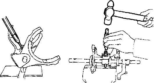 b. Using a pin punch and hammer, drive out the slotted spring pin from the No. 1 fork shaft.