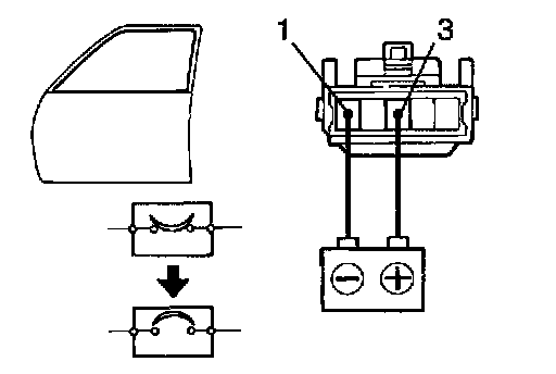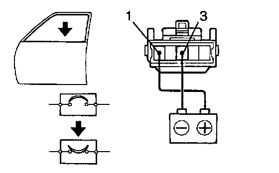 b. Connect the positive (+) lead from the battery to terminal 3 and the negative (-) lead to terminal 1 on the wire harness side connector, and raise the window to full closed position.