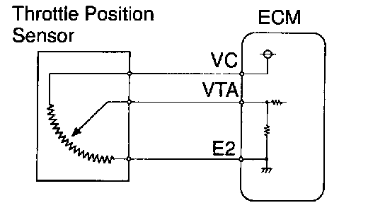 The throttle position sensor is mounted in the throttle body and detects the throttle valve operating angle. When the throttle valve is fully closed, a voltage of approximately 0.3 - 0.8 V is applied to terminal VTA of the ECM. The voltage applied to the terminal VTA of the ECM increases in proportion to the opening angle of the throttle valve and becomes approximately 3.2 - 4.9 V when the throttle valve is fully opened. The ECM judges the vehicle driving conditions from this signals input from terminals VTA and uses it as one of the conditions for deciding the air-fuel ratio correction, power increases correction and fuel-cut control etc.