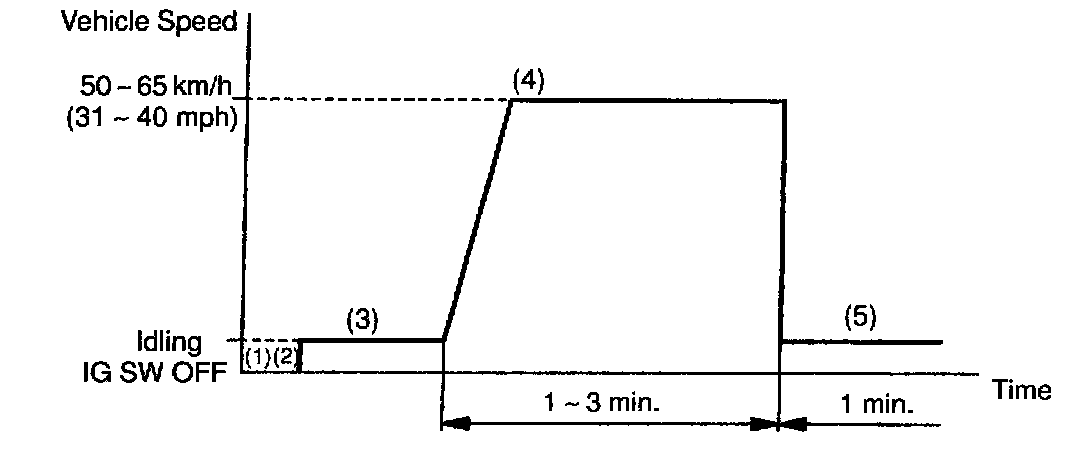 4. Drive the vehicle at 50 - 65 kph (31 - 40 mph) for 1 - 3 min. to warm up the heated oxygen sensor.