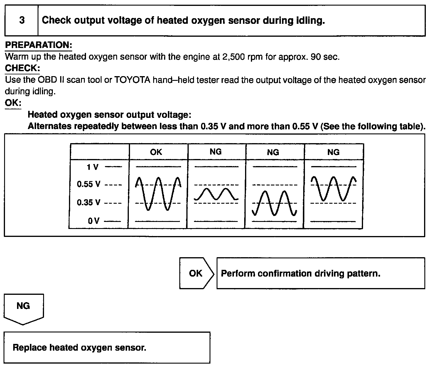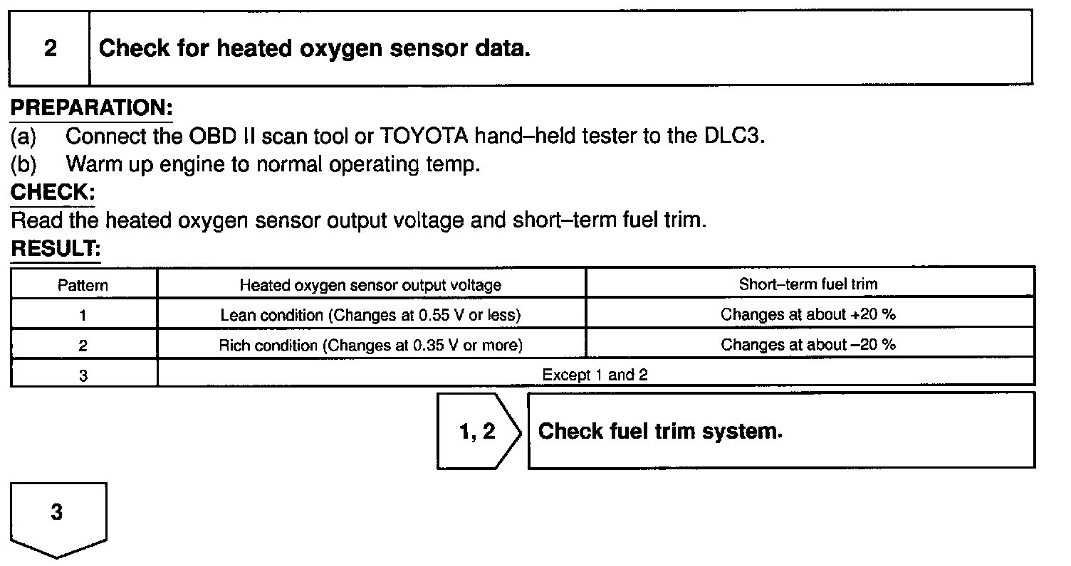HINT: The heated oxygen sensor output voltage and the short-term fuel trim value can be read using the OBD II scan tool or TOYOTA hand-held tester.