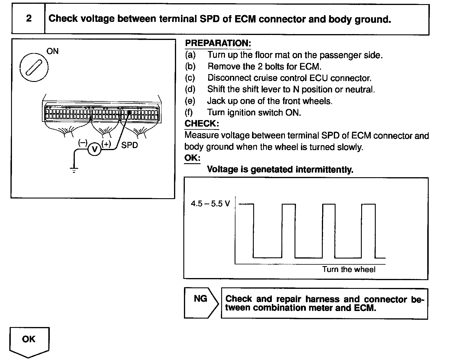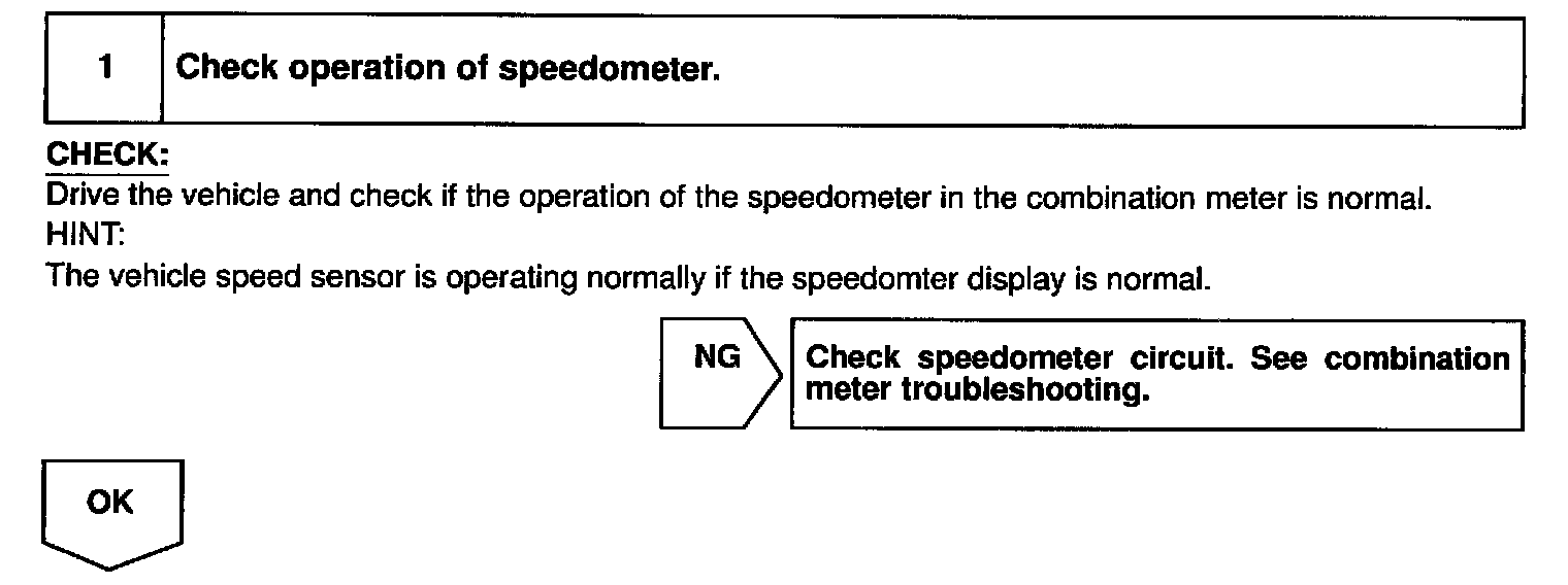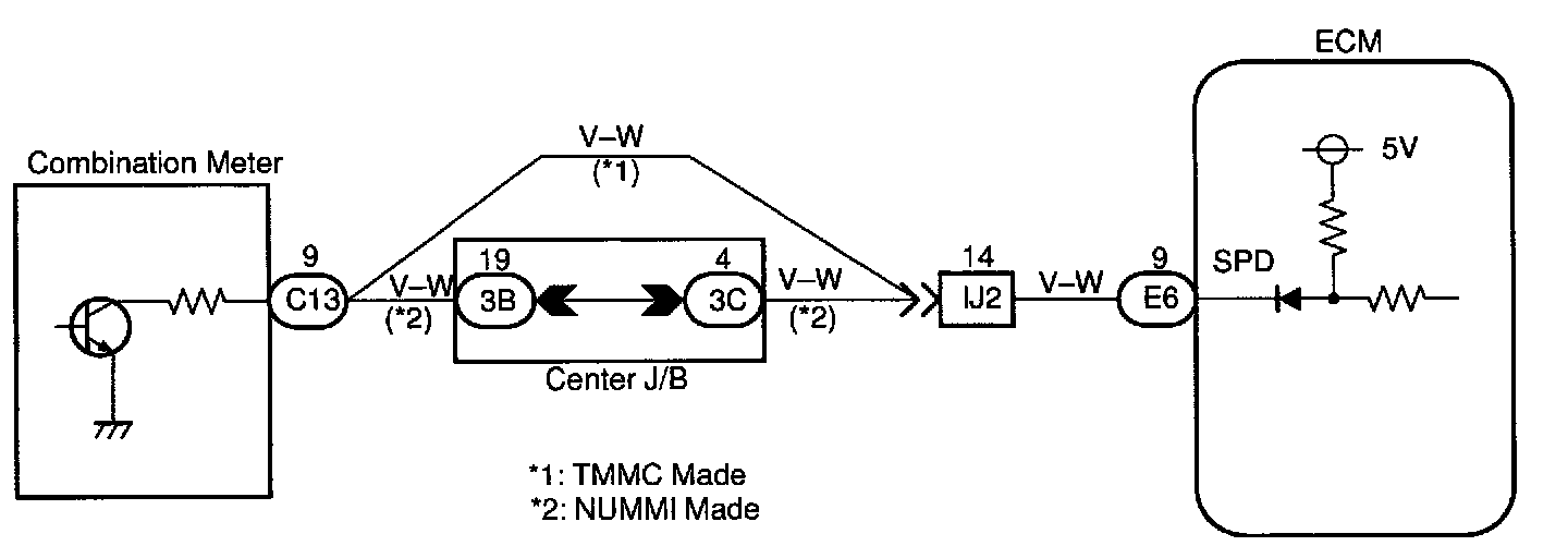 The vehicle speed sensor outputs a 4-pulse signal for every revolution of the rotor shaft, which is rotated by the transmission output shaft via the driven gear. After this signal is converted into a more precise rectangular waveform by the waveform shaping circuit inside the combination meter, it is then transmitted to the ECM. The ECM determines the vehicle speed sensor based on the frequency of these pulse signals.
