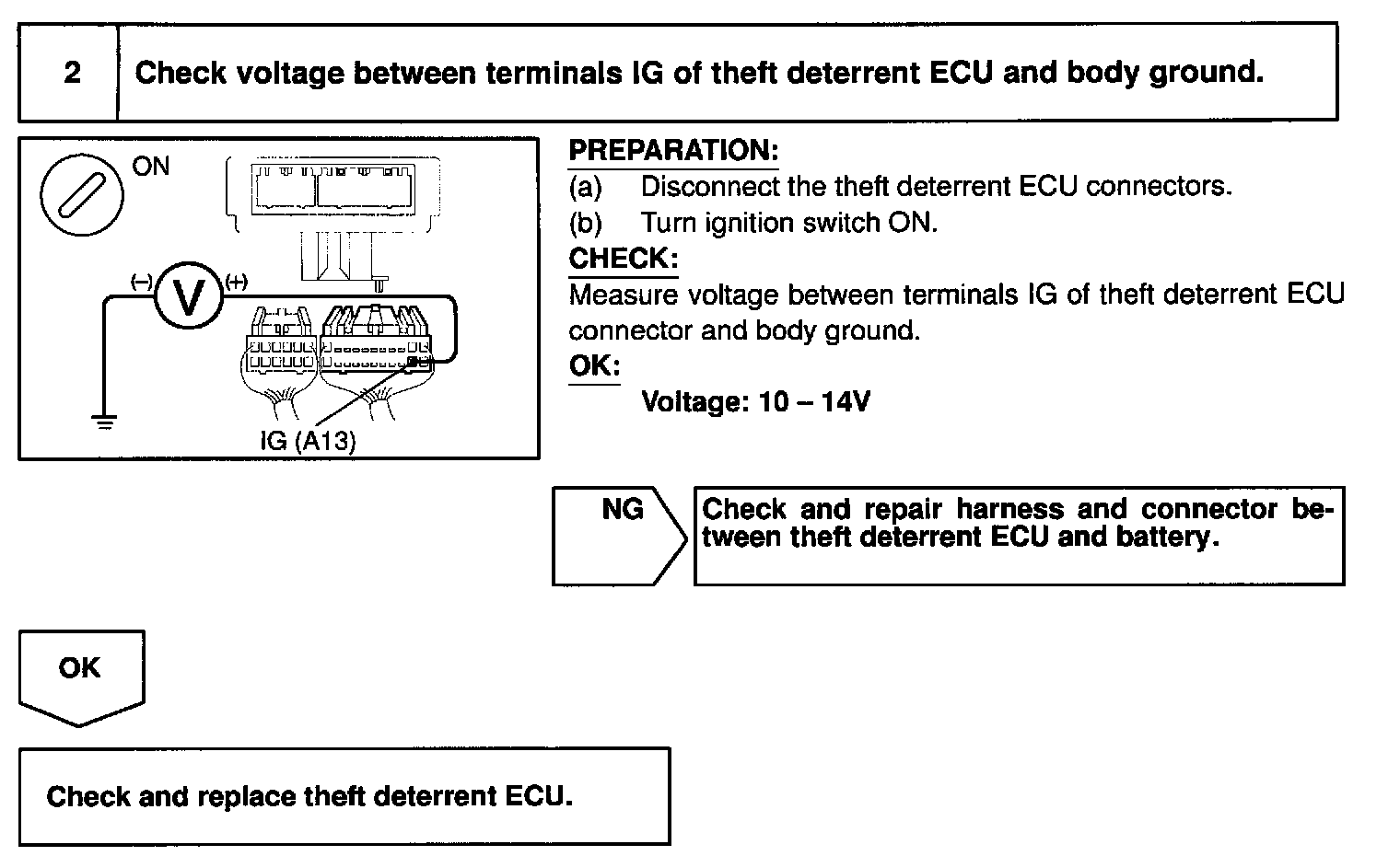 CIRCUIT DESCRIPTIONWhen the ignition switch is turned to the ON position, battery positive voltage is applied to the terminals IG of the ECU. When the battery positive voltage is applied to the terminal IG of the ECU while the theft deterrent system is activated, the warning stops. Furthermore, power supplied from the terminals IG of the ECU is used as power for the door courtesy switch, and position switch, etc.