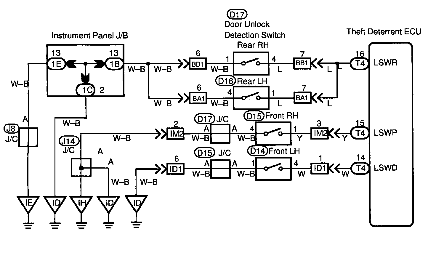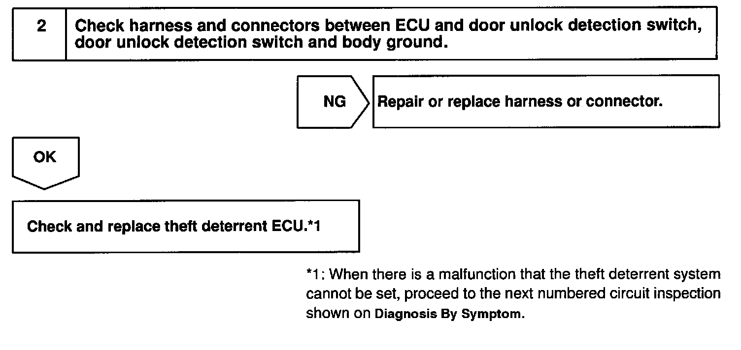 CIRCUIT DESCRIPTIONThe door unlock detection switch is built in the door lock motor assembly. This switch is on when the door lock knob is in the unlock position and off when the lock knob is in the lock position. The ECU detects the door lock knob conditions is this circuit. It is used as one of the operating conditions for the key confinement prevention function.