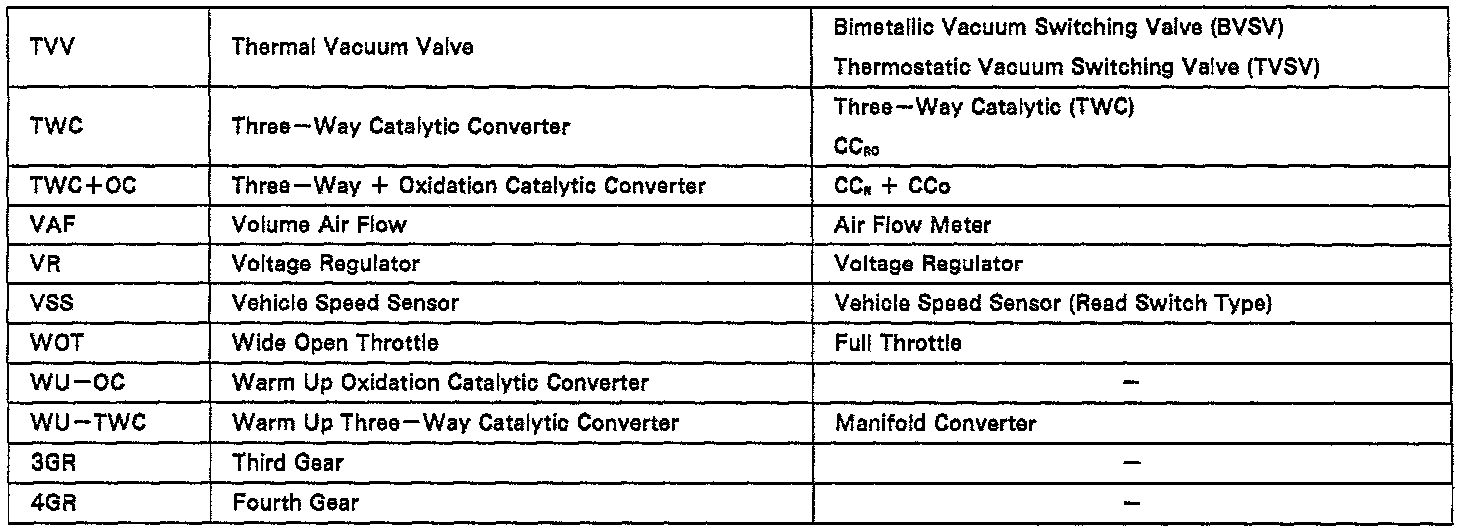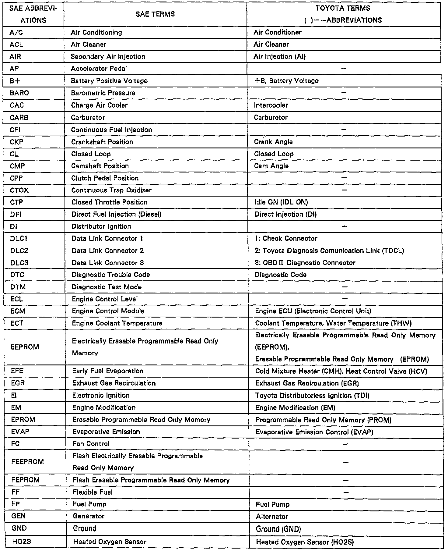 This glossary lists all SAE - J193O terms and abbreviations used in this manual in compliance with SAE recommendations, as well as their Toyota equivalents.