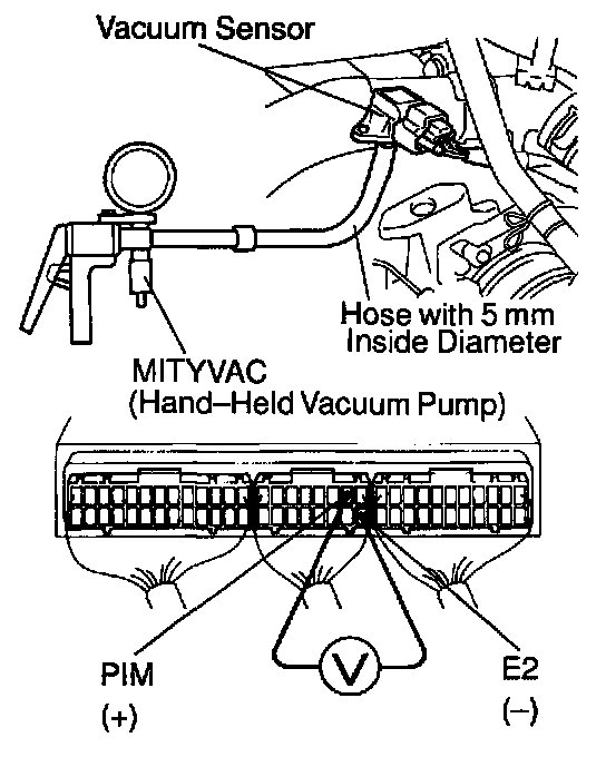 d. Connect a voltmeter to terminals PIM and E2 of the ECM, and measure the output voltage under ambient.