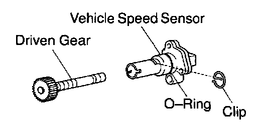 b. Remove the clip and the speedometer driven gear from the vehicle speed sensor.