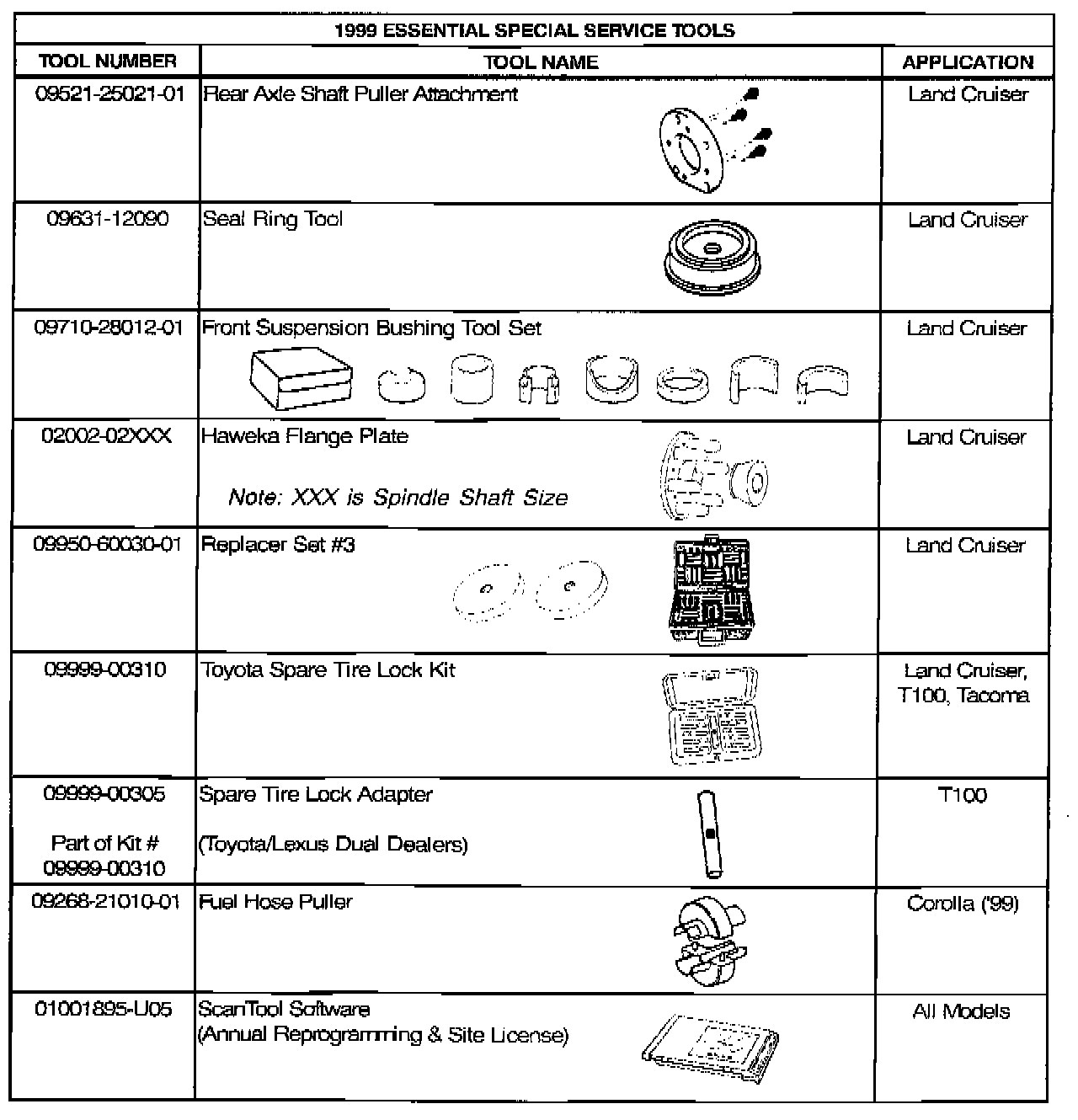 This TSB contains information regarding Special Service Tools (SSTs) distributed or added to the SST program during 1999 model year. Both the Essential and Available SSTs are listed by tool number, tool name, and model application.