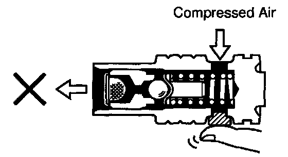 b. Check the flow control valve for leakage. Close one of the holes and apply compressed air of 392 - 490 kPa (4 - 5 kgf/cm2, 57 - 71 psi) into the opposite side hole, and confirm that air does not come out from the end hole.