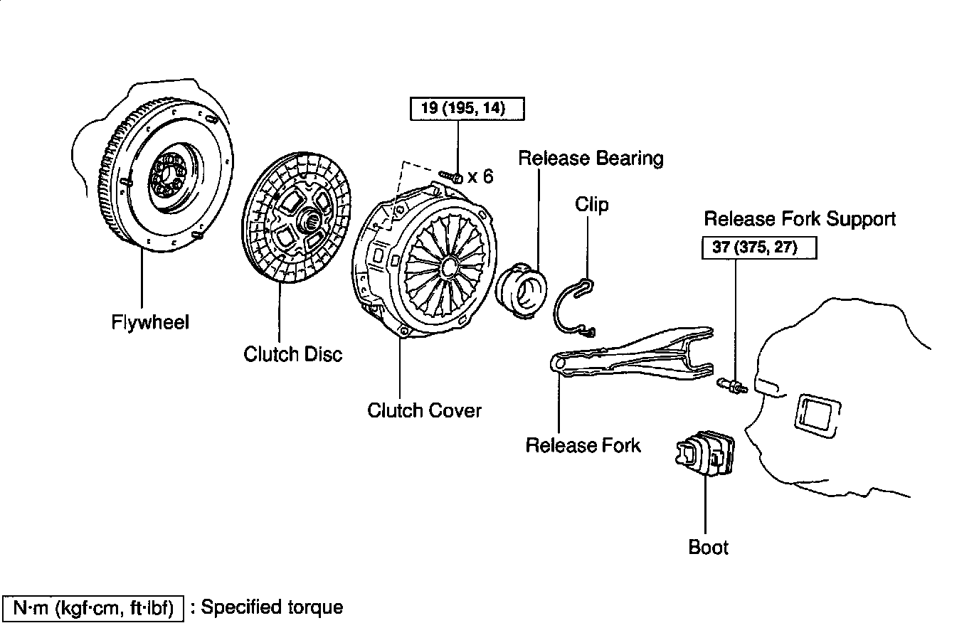 a. Apply molybdenum disulphide lithium base grease to the release fork and release bearing contact point, release fork and push rod contact point and release fork and pivot point.