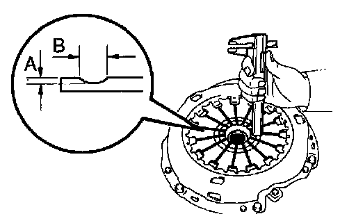 Using calipers, measure the diaphragm spring for depth and width of wear.