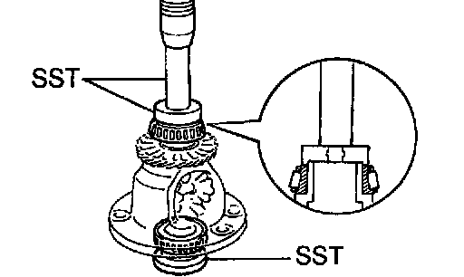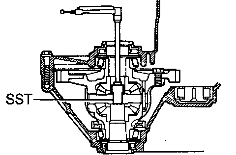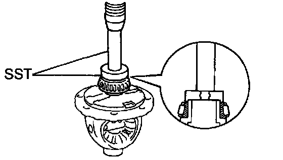 HINT: Set the claw of SST to the bearing inner race at the position where the differential case is indented.