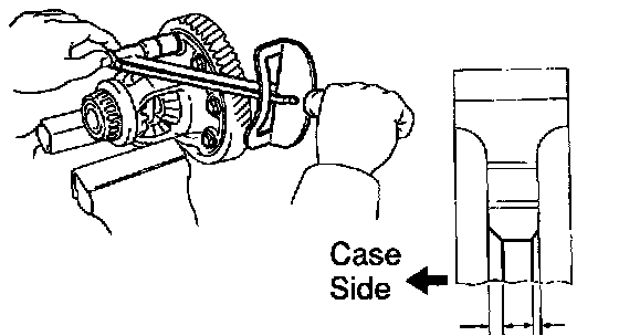 Measure the side gear backlash while holding one pinion gear toward the case.