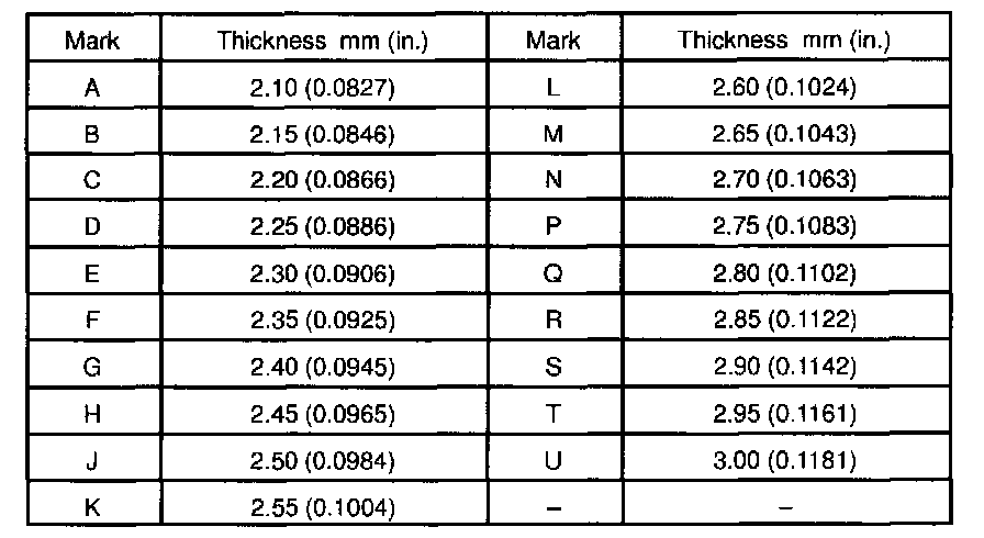a. Install the correct thrust washers to the side gears. Refer to the table below, select thrust washers which will allow that the backlash is within the specification.