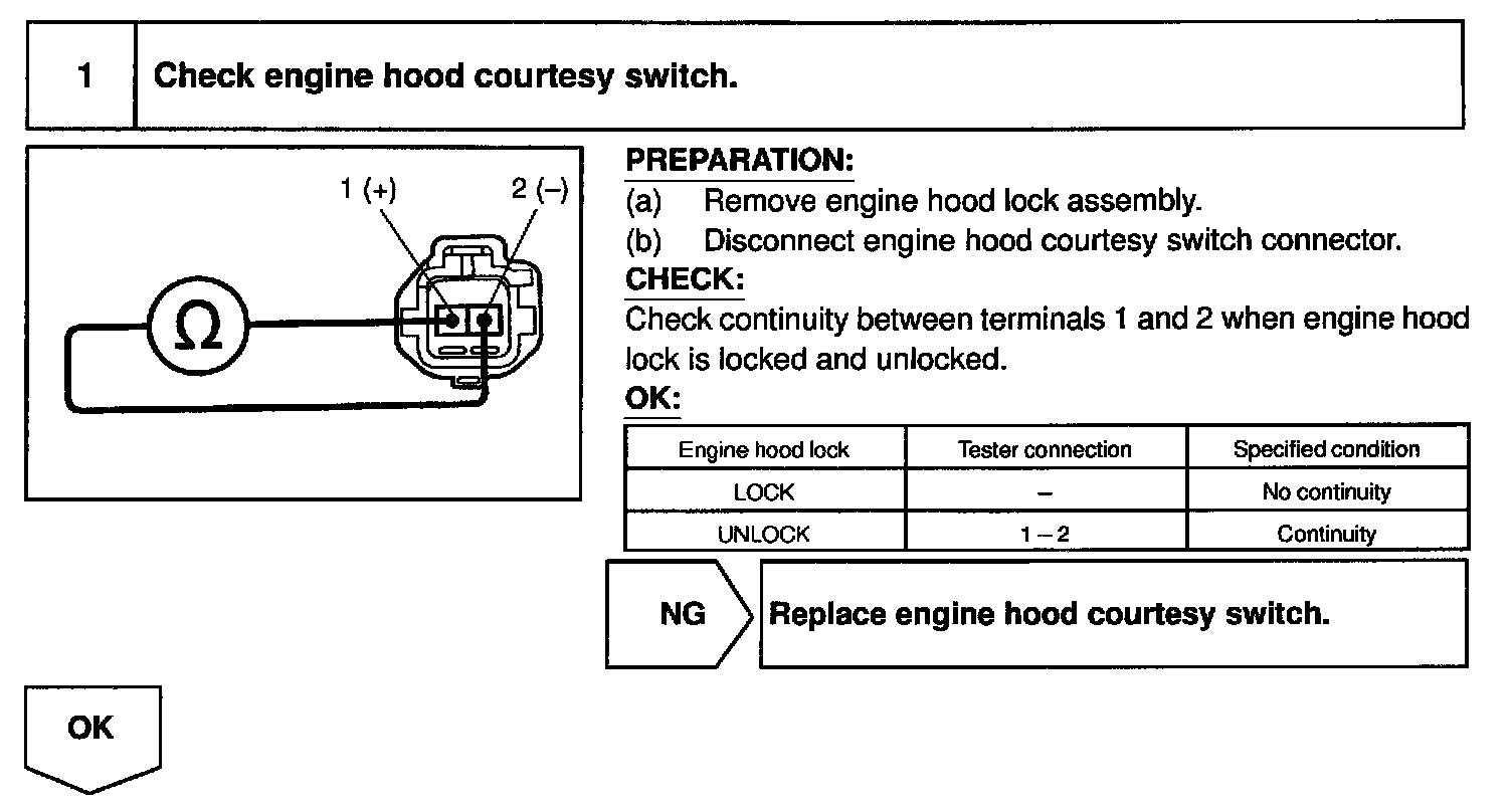 The engine hood courtesy switch is built into the engine hood lock assembly and goes on when the engine hood is opened and goes off when the engine hood is closed.
