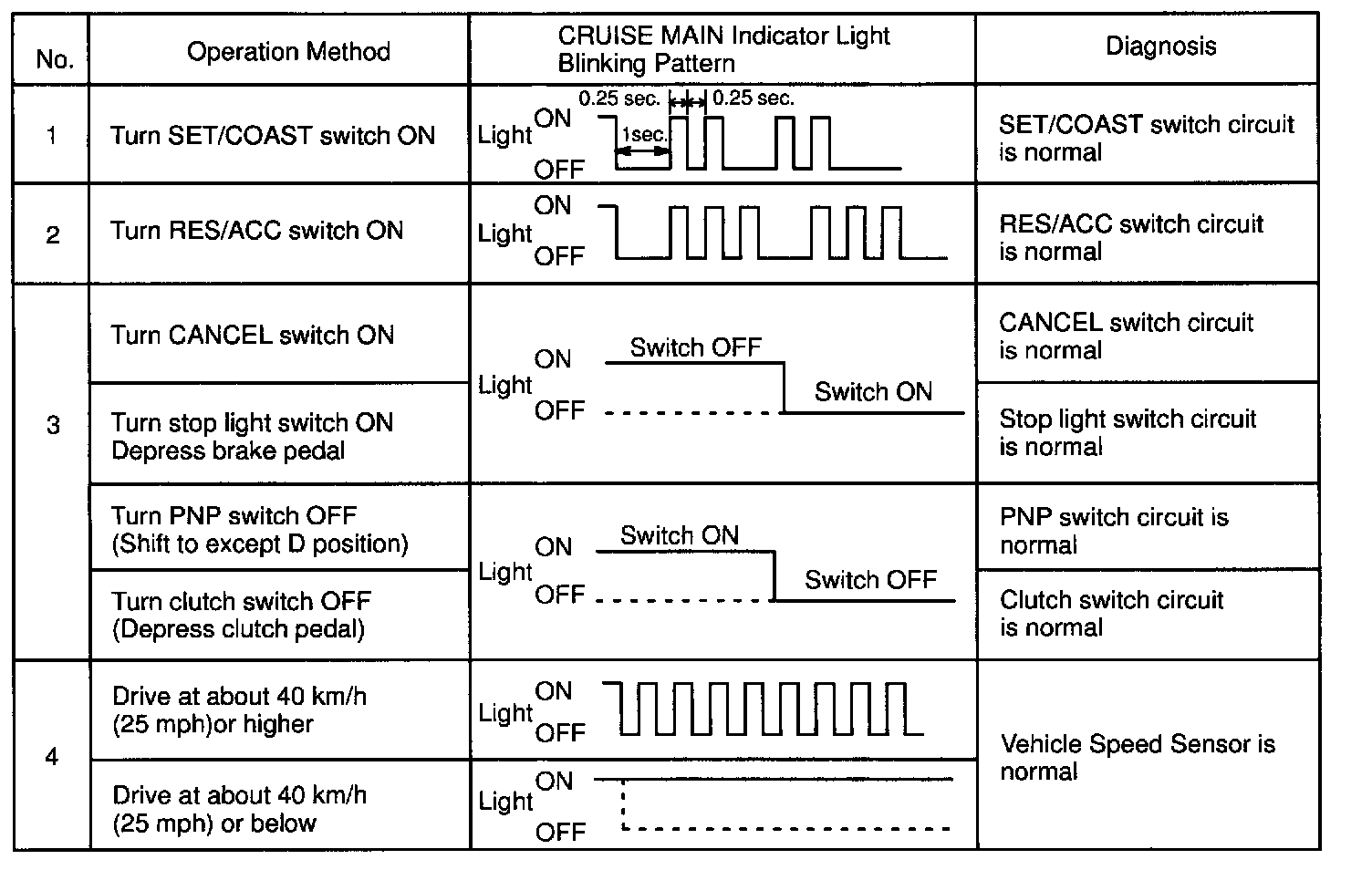 f. Read the blinking pattern of the CRUISE MAIN indicator light.