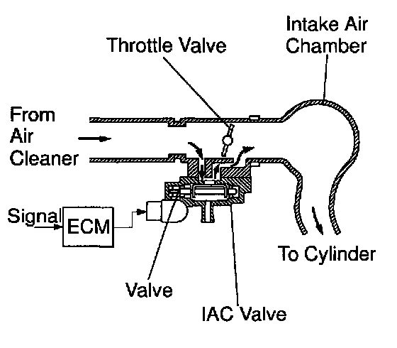 The rotary solenoid type IAC valve is located on the throttle body and intake air bypassing the throttle valve is directed to the IAC valve through a passage.