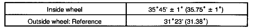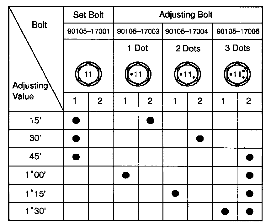 If the camber is not within the specified value, using the following table, estimate how much additional camber adjustment will be required, and select the camber adjusting bolt.