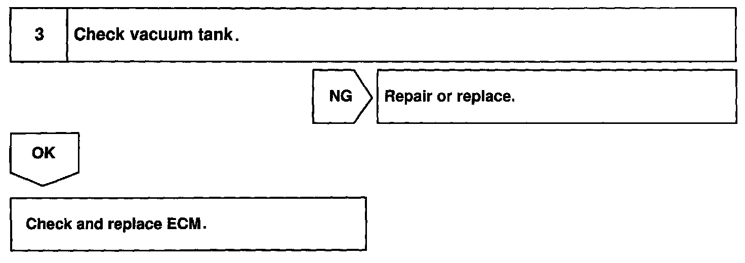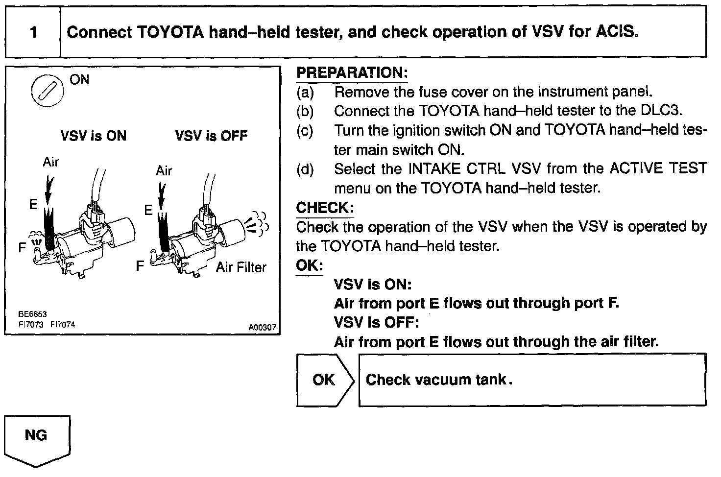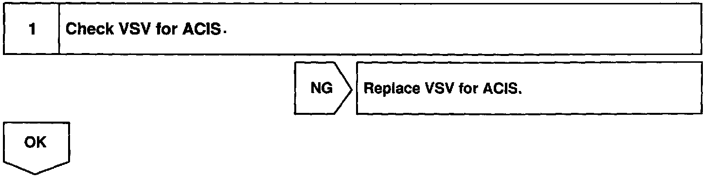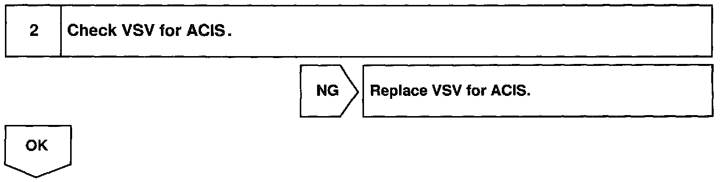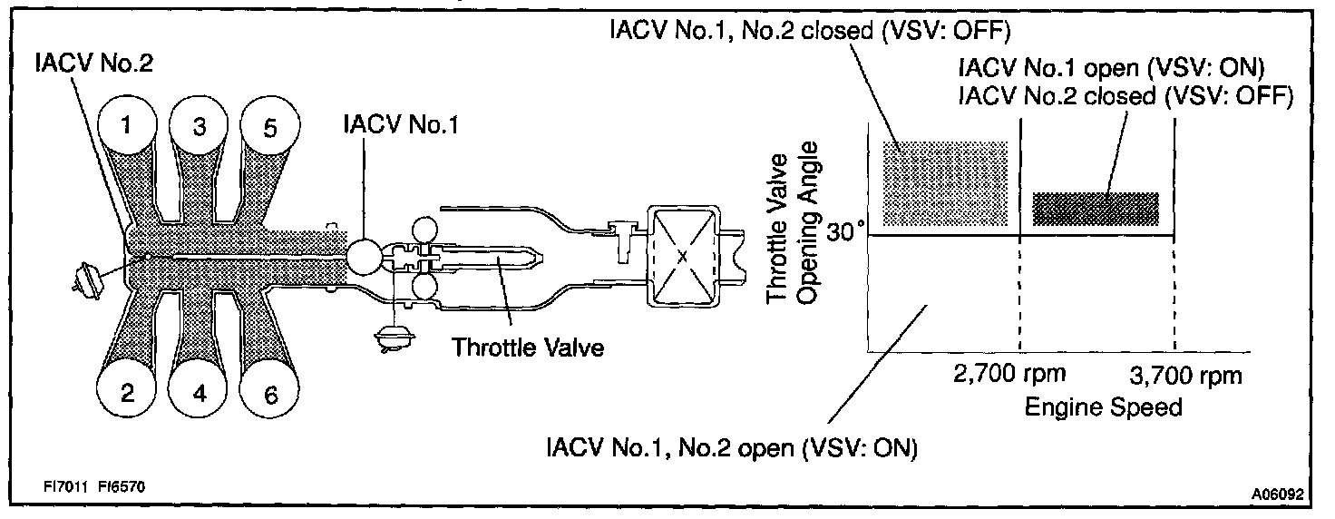 When the engine speed is 3,700 rpm or less and the throttle valve opening angle is 30° or more, the ECM turns the two VSV ON or OFF and operate the IACV.
