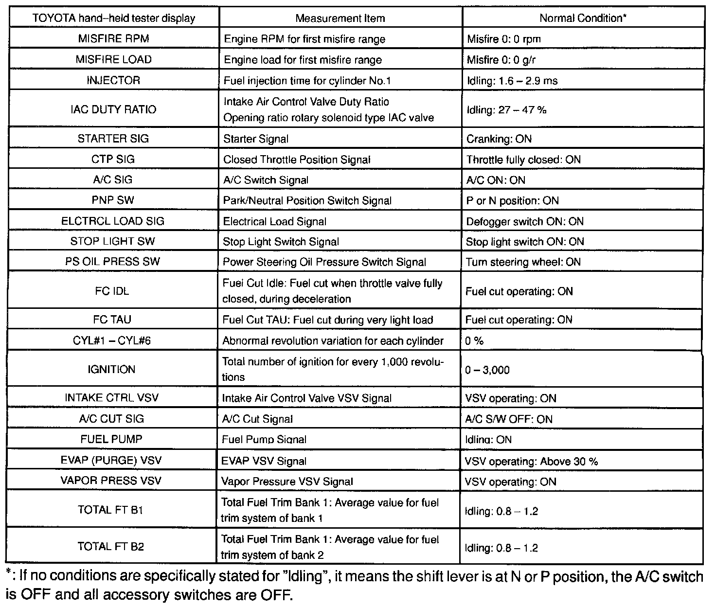 ENGINE OPERATING CONDITIONNOTE: The values given below for "Normal Condition" are representative values, so a vehicle may still be normal even if its value varies differ from those listed here. So do not decide whether a part is faulty or not solely according to the "Normal Condition" here.