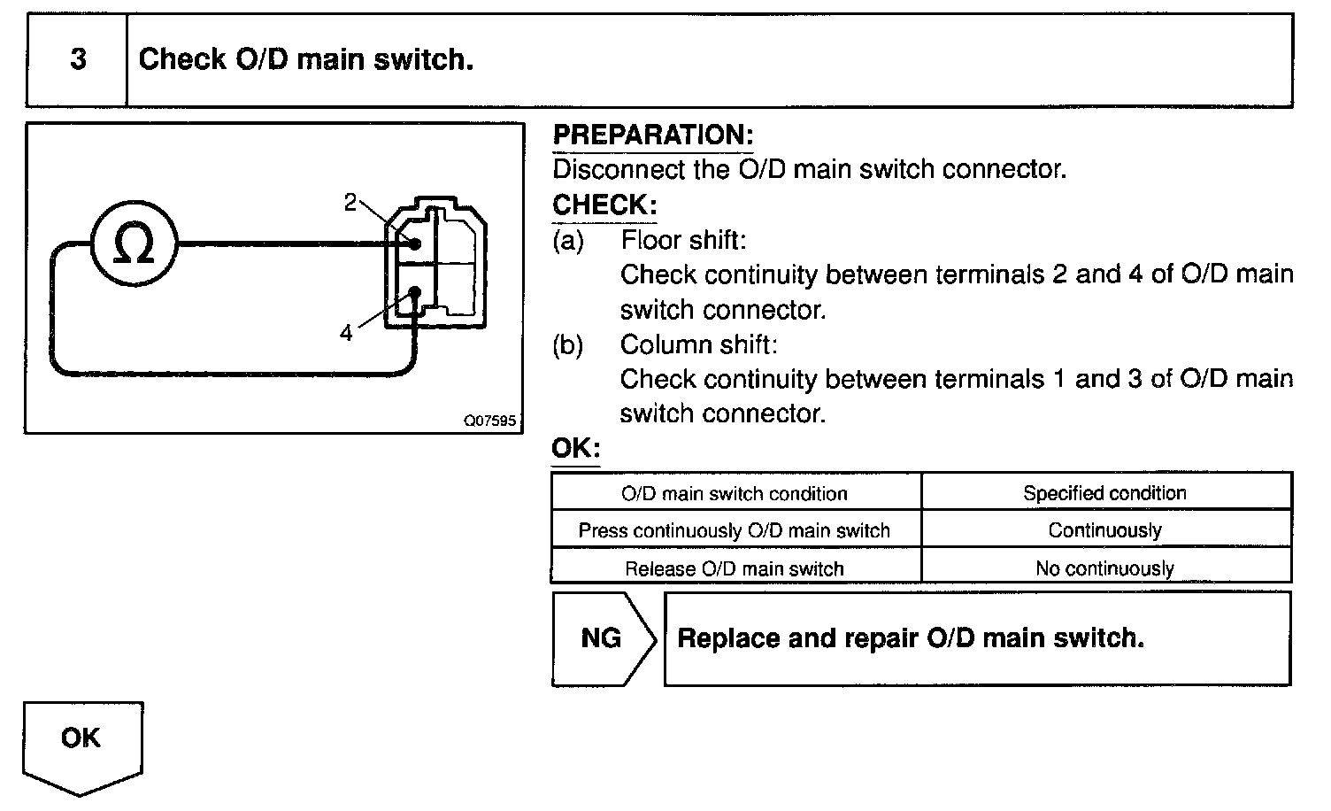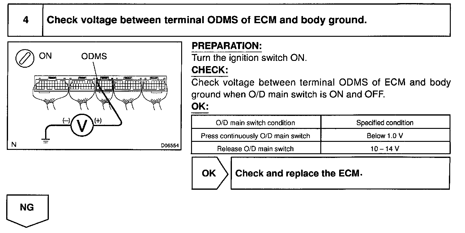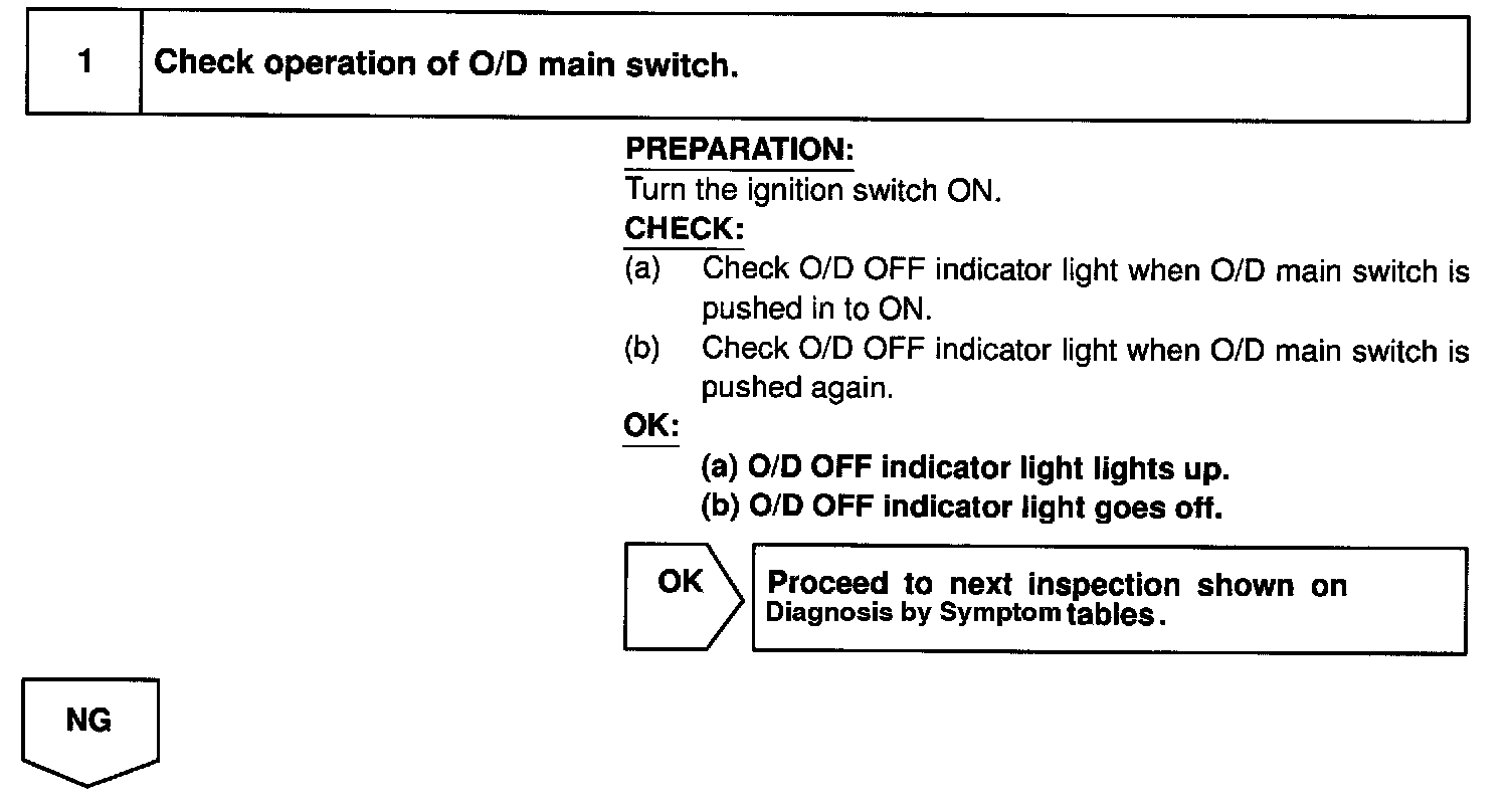 CIRCUIT DESCRIPTIONThe O/D main switch is a momentary type switch. When pressing the O/D OFF main switch, the O/D OFF indicator light lights up and ECM prohibits shifting to O/D, and when pressing it again, the O/D OFF indicator light goes off and ECM allows shifting to O/D. Turning the IG switch OFF will reset the O/D OFF indicator light.