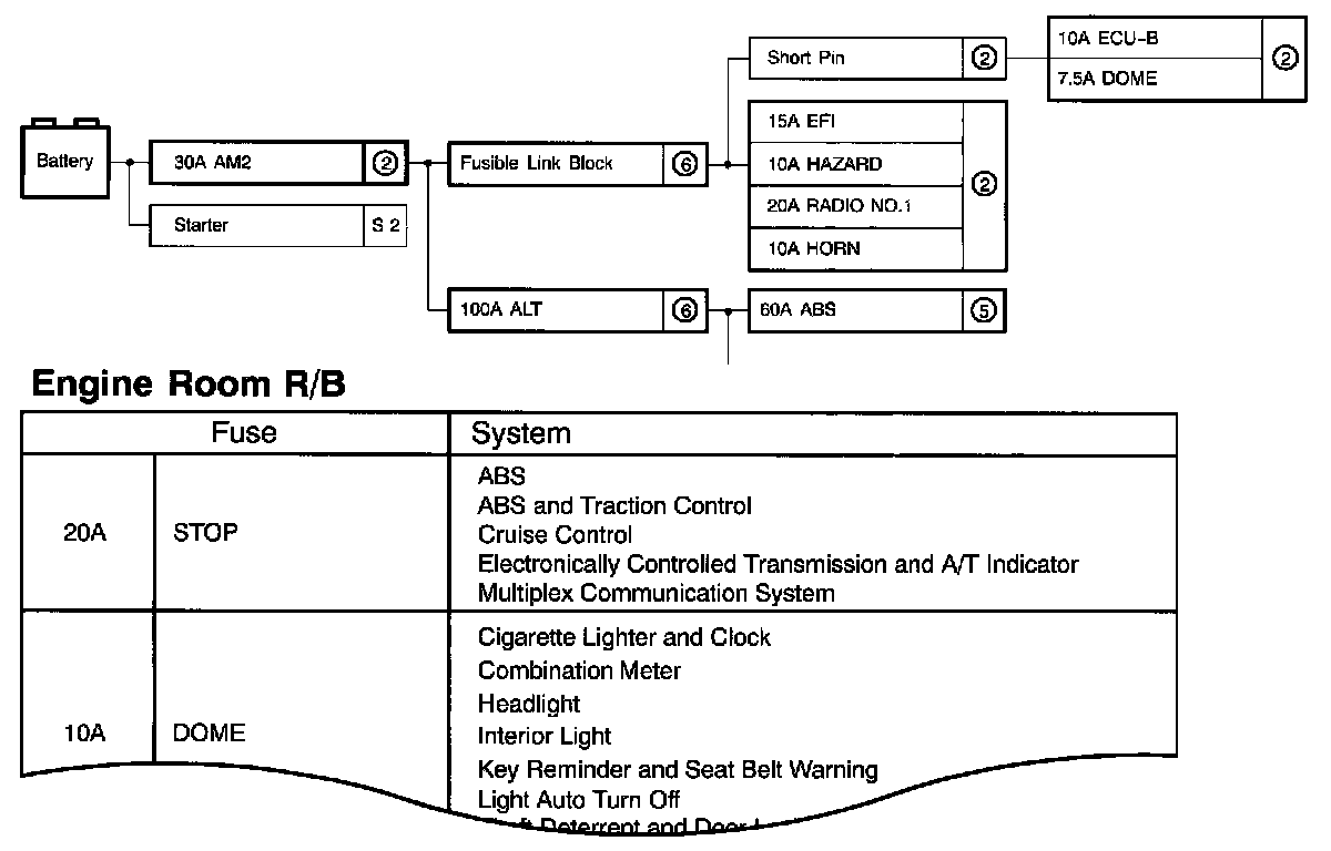 The chart shows the route by which current flows from the battery to each electrical source (Fusible Link, Circuit Breaker, Fuse, etc.) and other parts.
