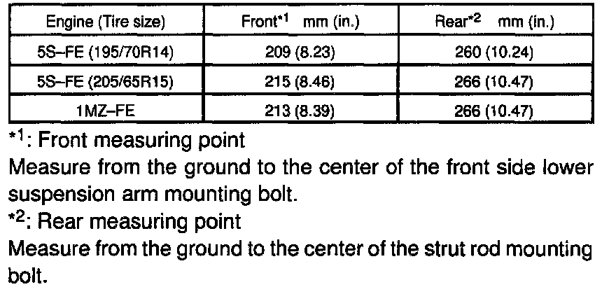 Measure from the ground to the center of the front side lower suspension arm mounting bolt.