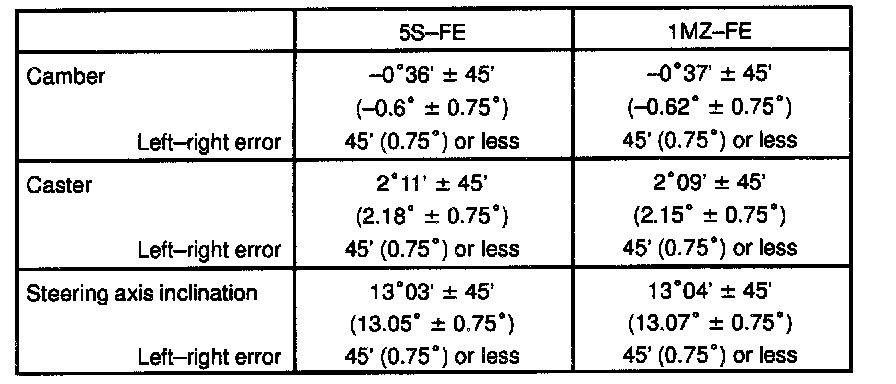 HINT: If the caster and steering axis inclination are not within the specification, after the camber has correctly adjusted, recheck the suspension parts for damaged and/or worn out parts.