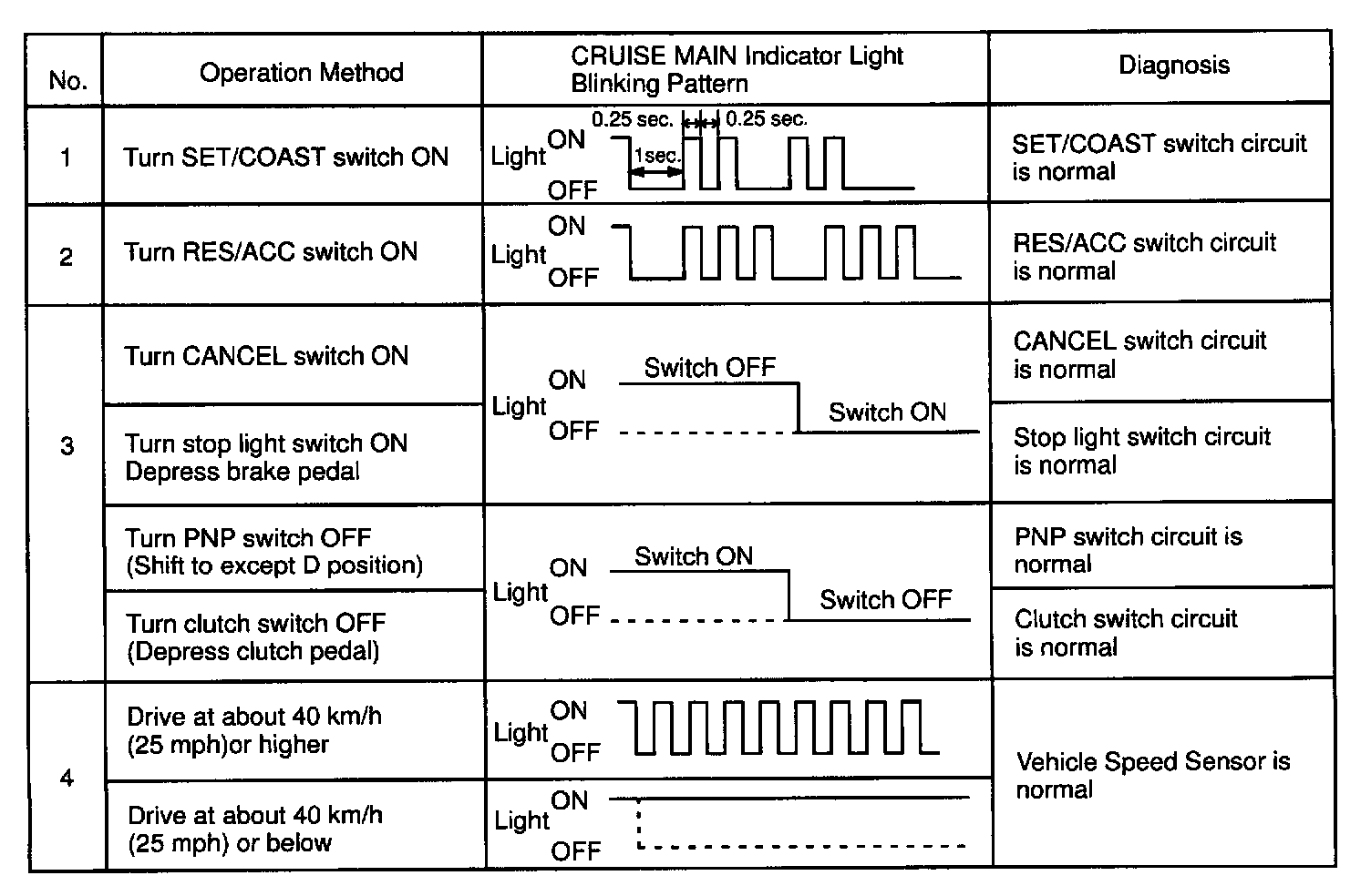 f. Read the blinking pattern of the CRUISE MAIN indicator light.