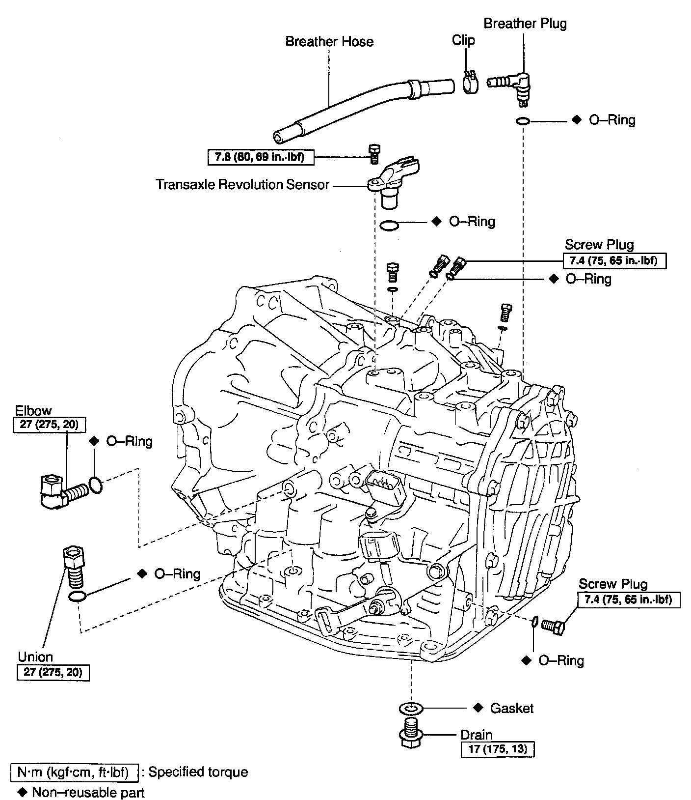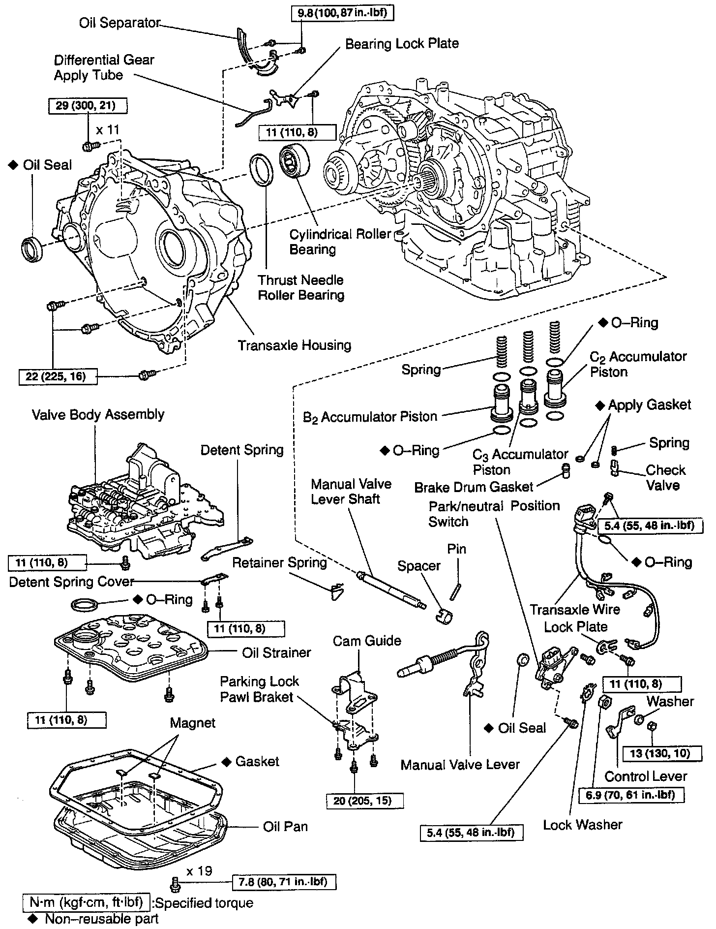 - The automatic transaxle is composed of highly precision-finished parts, necessitating careful inspection before reassembly because even a small nick could cause fluid leakage or affect the performance. The instructions here are organized so that you work on only one component group at a time. This will help avoid confusion from similar-looking parts of different sub-assemblies being on your workbench at the same time. The component groups are inspected and repaired from the converter housing side. As much as possible, complete the inspection, repair and reassembly before proceeding to the next component group. If a defect is found in a certain component group during reassembly, inspect and repair this group immediately. If a component group cannot be assembled because parts are being ordered, be sure to keep all parts of the group in a separate container while proceeding with disassembly, inspection, repair and reassembly of other component groups.