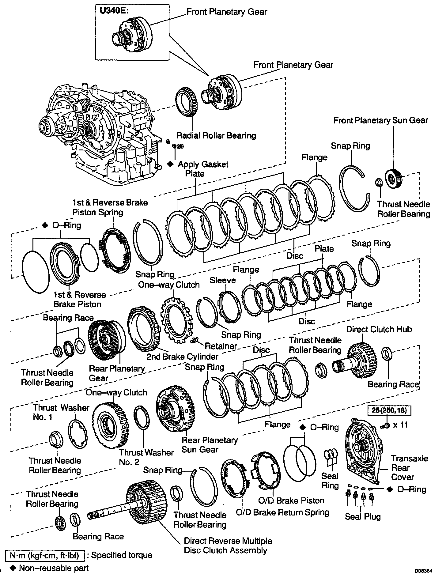 - New discs for the brakes and clutches that are to be used for replacement must be soaked in ATF for at least 15 minutes before reassembly.