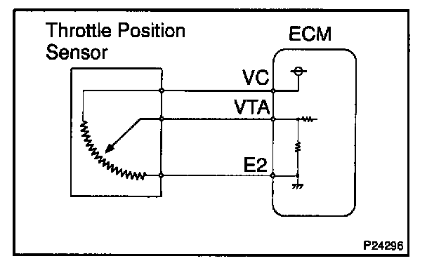 The throttle position sensor is mounted in the throttle body and detects the throttle valve operating angle. When the throttle valve is fully closed, a voltage of approximately 0.3 - 0.8 V is applied to terminal VTA of the ECM. The voltage applied to the terminal VTA of the ECM increases in proportion to the opening angle of the throttle valve and becomes approximately 3.2 - 4.9 V when the throttle valve is fully opened. The ECM judges the vehicle driving conditions from this signals input from terminals VTA and uses it as one of the conditions for deciding the air-fuel ratio correction, power increases correction and fuel-cut control etc.