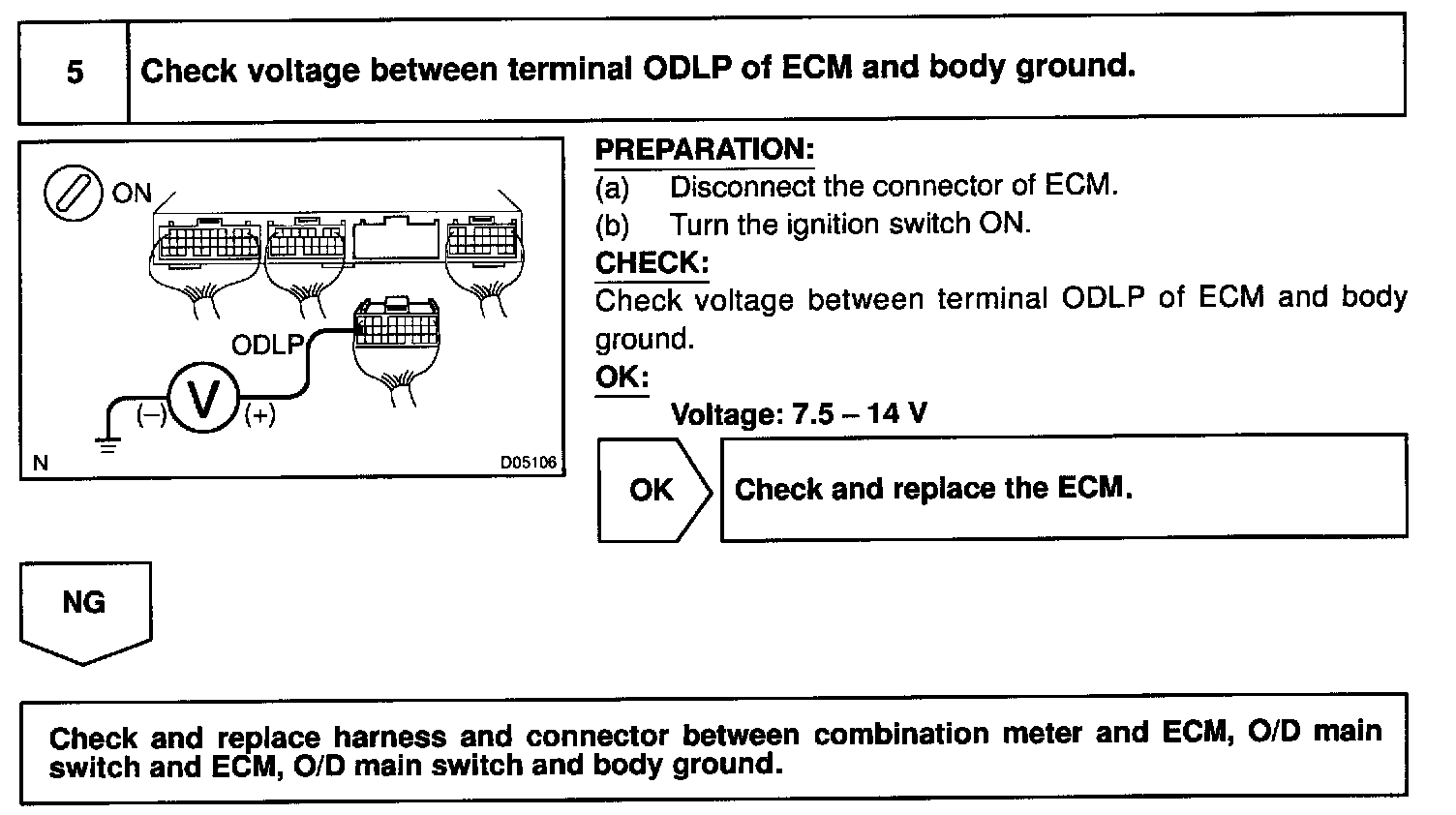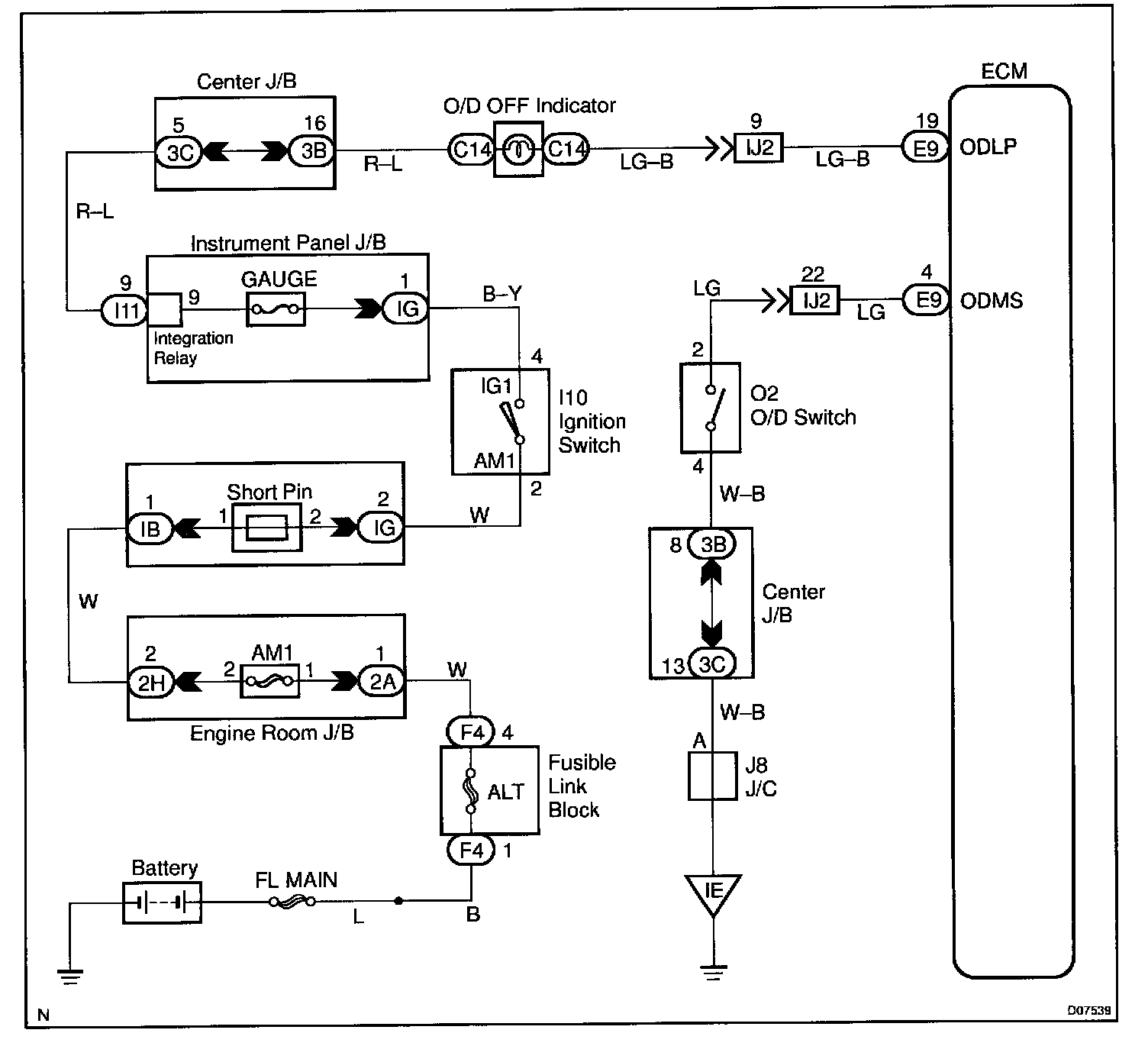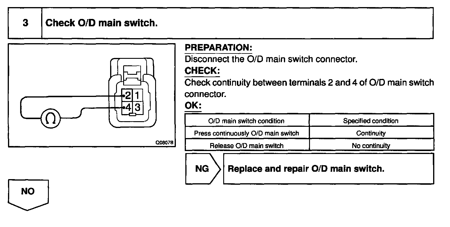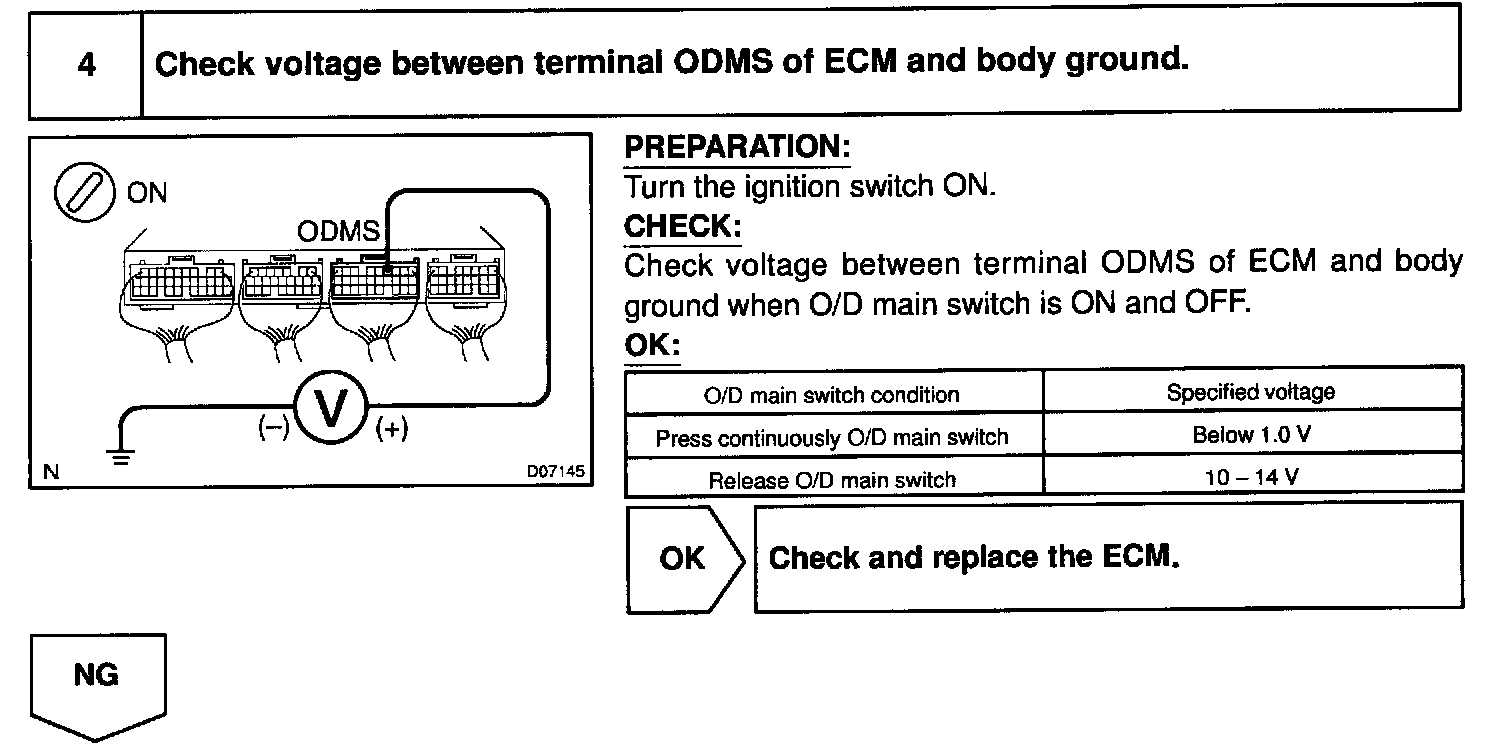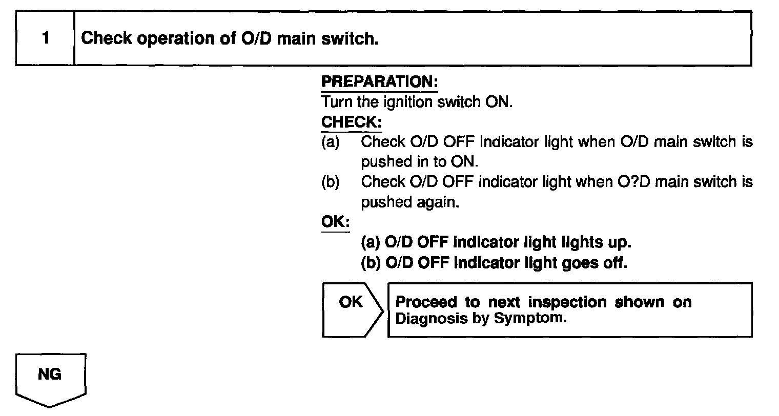 CIRCUIT INSPECTIONThe O/D main switch is a momentary type switch When pressing the O/D main switch, the O/D OFF indicator light lights up and ECM prohibits shifting to O/D, and when pressing it again, the O/D OFF indicator light goes off and ECM allows shifting to O/D. Turning the IG switch OFF will reset the O/D OFF indicator light.