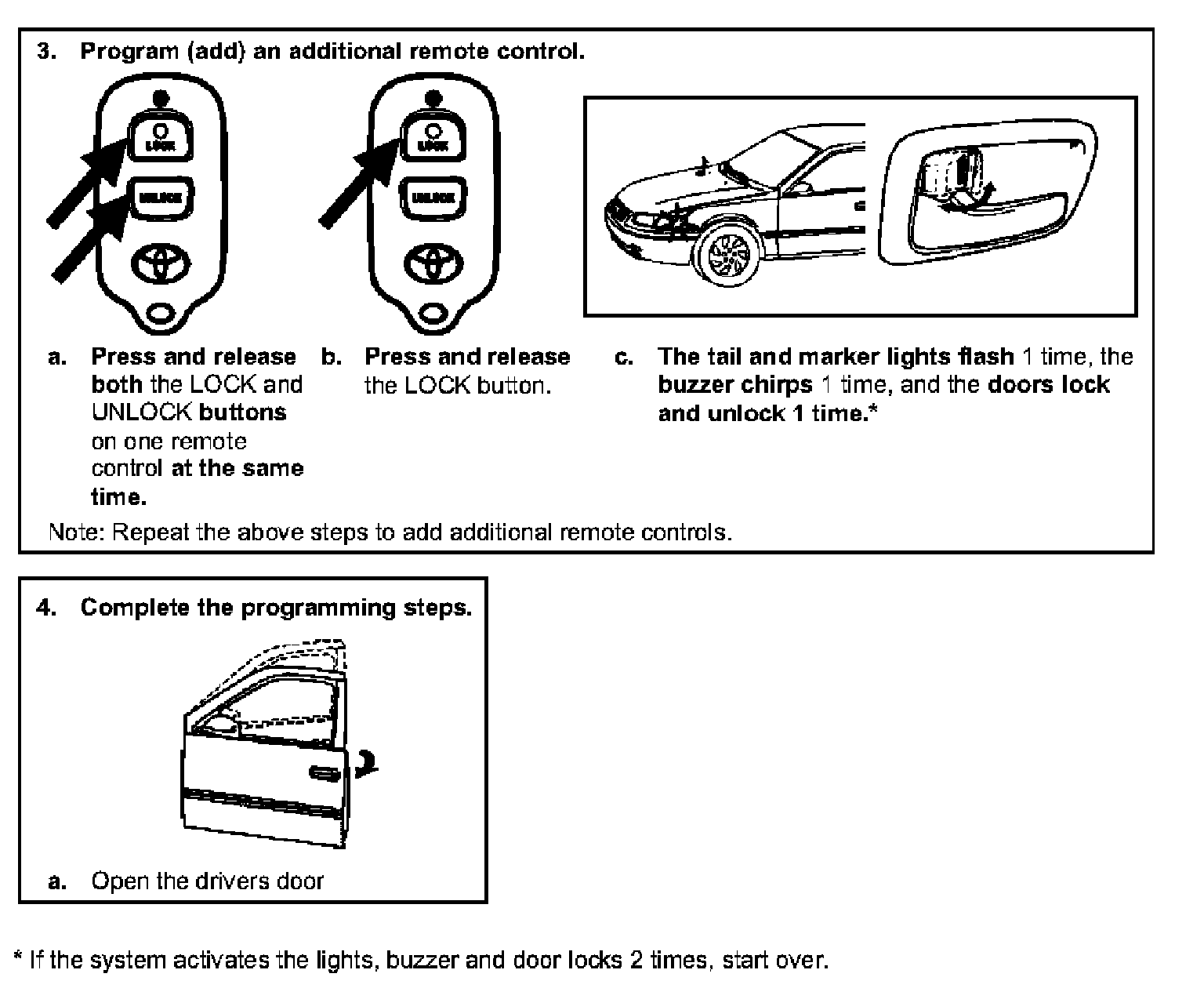 Follow this procedure to add additional remote controls to a system. The RS3200 may be programmed to operate with a maximum of four remote controls. When a new remote controls is programmed, it will work in the default operation mode (press the UNLOCK button twice to unlock all doors and no AUX button function on 4 button remote controls); to change the operation mode, you must perform the separate REMOTE CONTROL FUNCTION SELECT procedure.