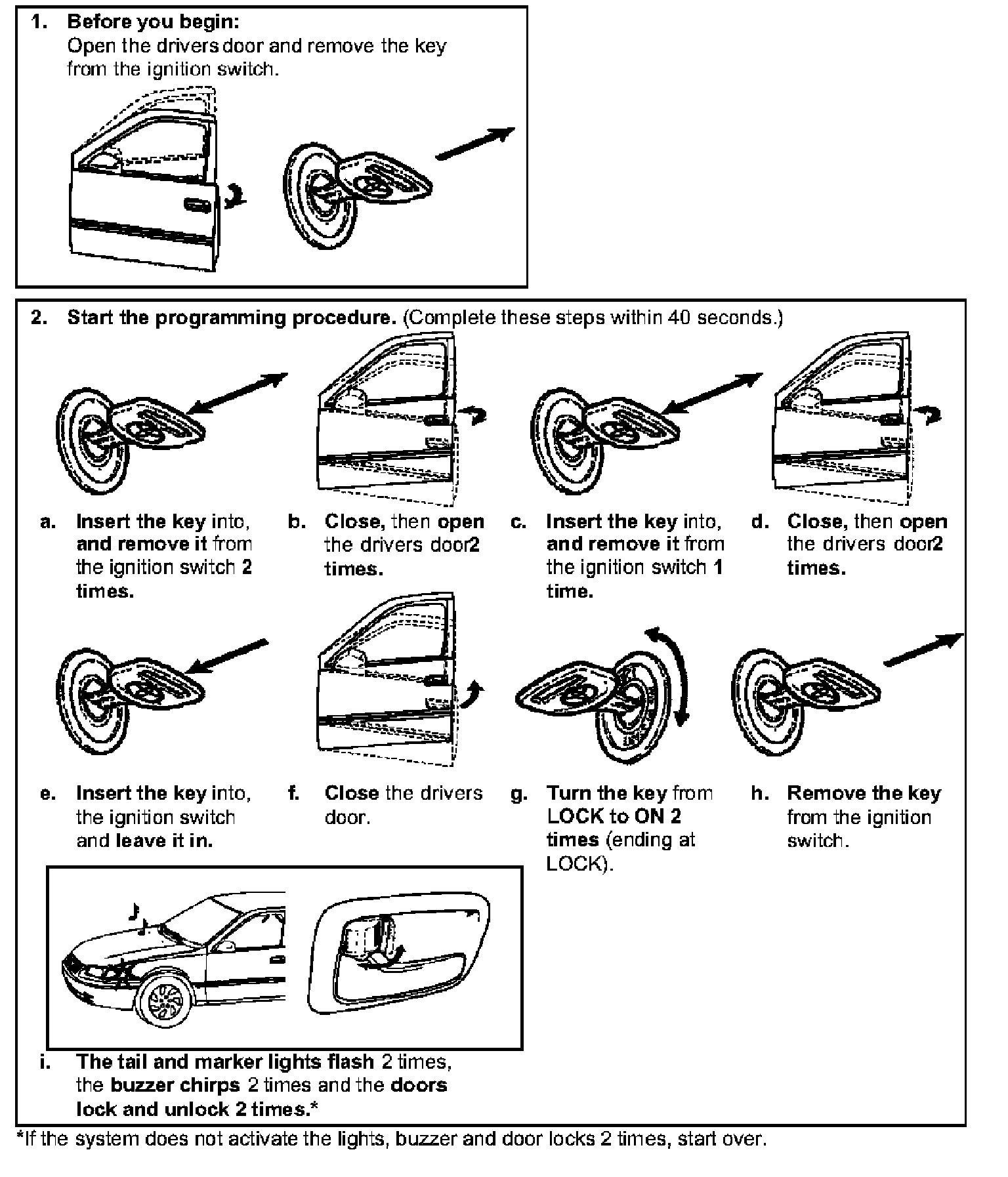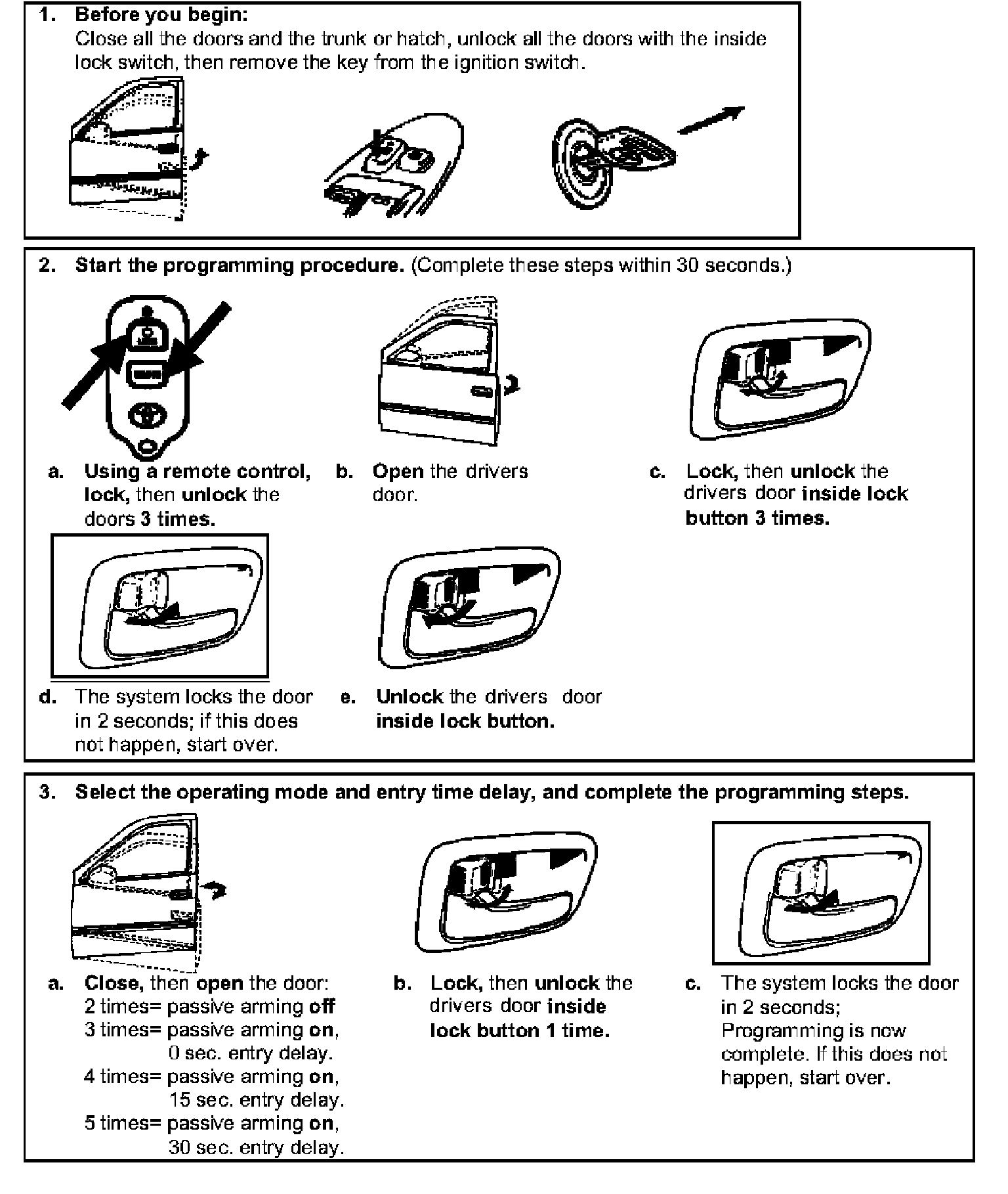 When all doors are closed, the RS3200 is factory set to automatically lock the vehicle's door when the ignition key is turned to ON or START, and unlock them (open or not) when the key is turned back to ACC or LOCK. Follow the procedure below to change this feature's operation mode.