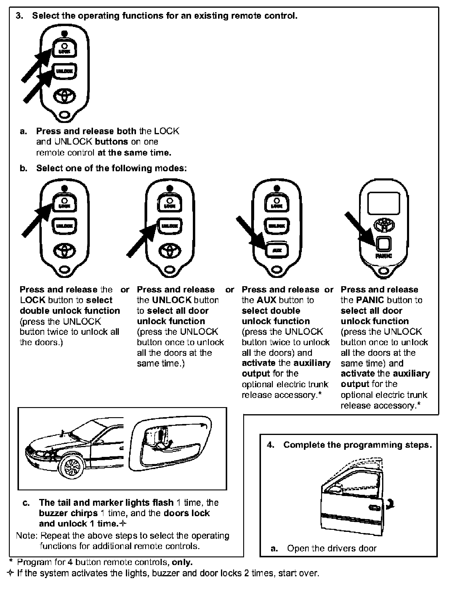 Follow this procedure to change the operating functions of remote controls already programmed into a system. You may change the remote controls default unlock operation mode so that pressing the UNLOCK button once causes all doors to unlock at the same time. Also, you may activate the AUX button function on 4 button remote controls.