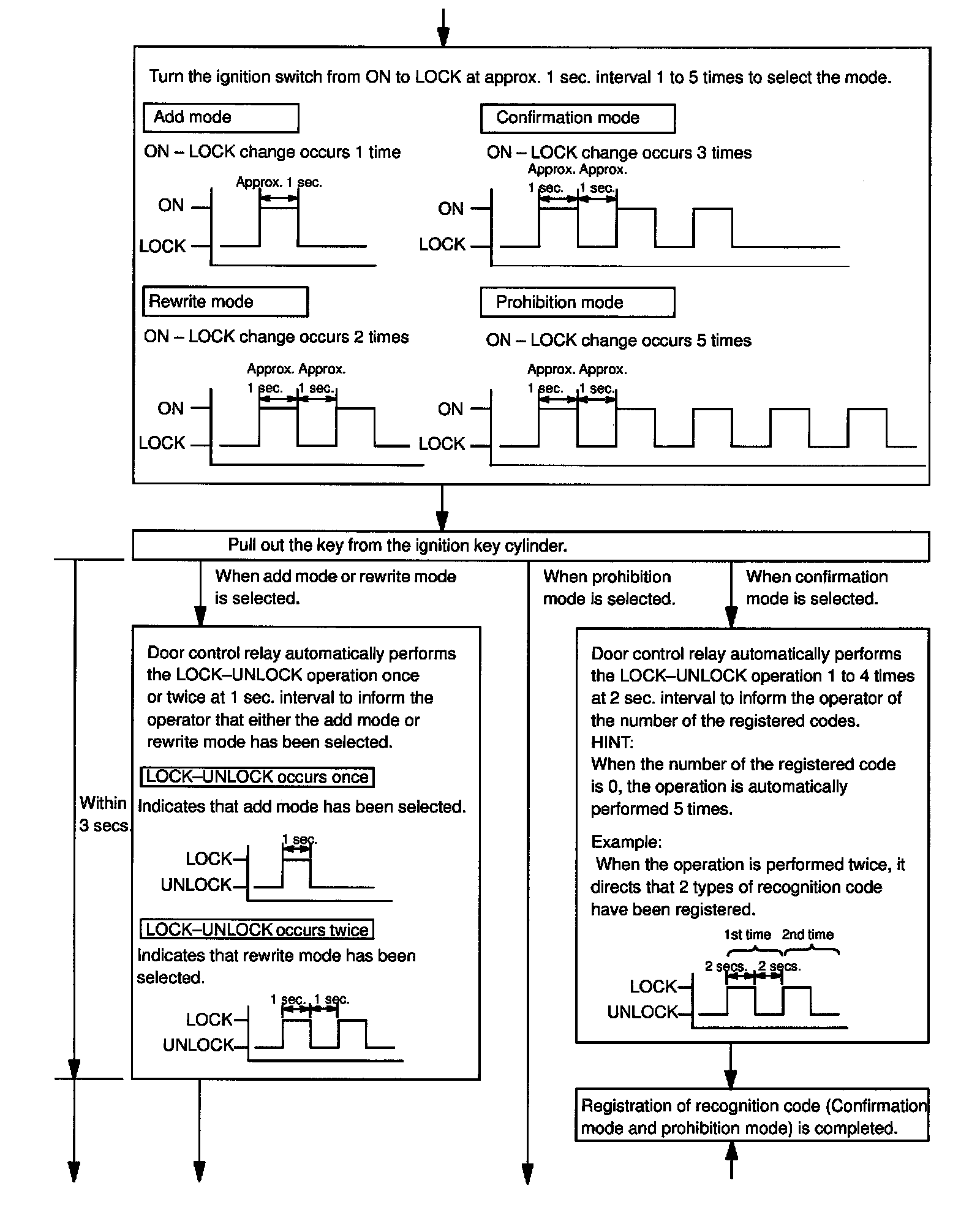 - The add mode is used to retain codes already registered while you register new recognition codes. This mode is used when adding a transmitter. However, if the number of registered codes exceeds 4 codes, previously registered codes are correspondingly erased in order, starting from the first registered code.