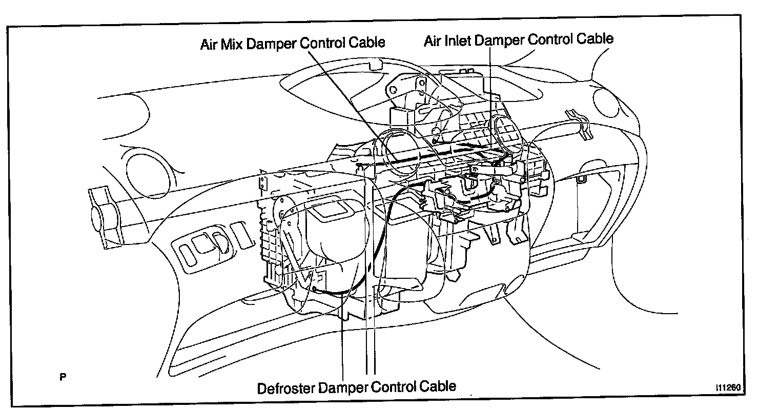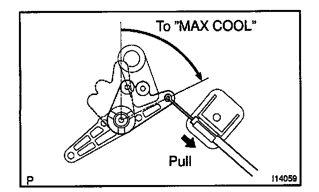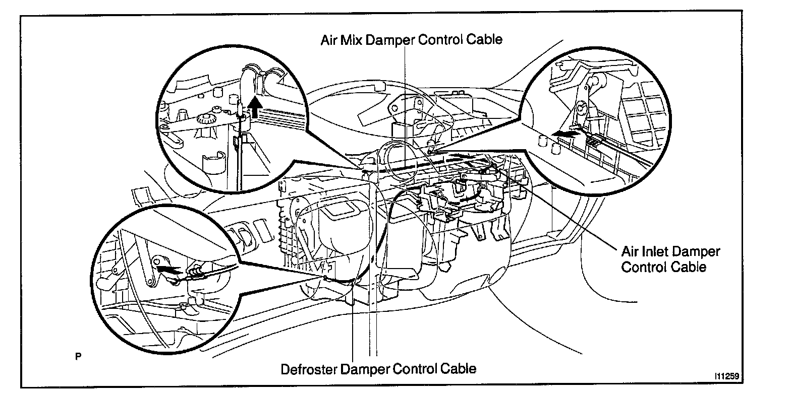 Set air mix damper control lever to "MAX. COOL" position and connect the inner cable to lever pin and clamp the outer cable.