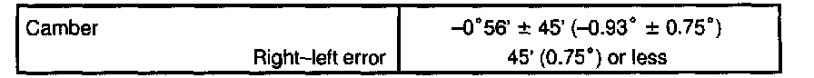 If the measured value is not within the specified value, inspect the suspension parts for damage and/or wear and replace them if necessary because camber is not adjustable.