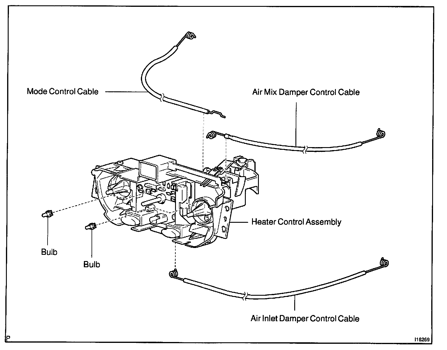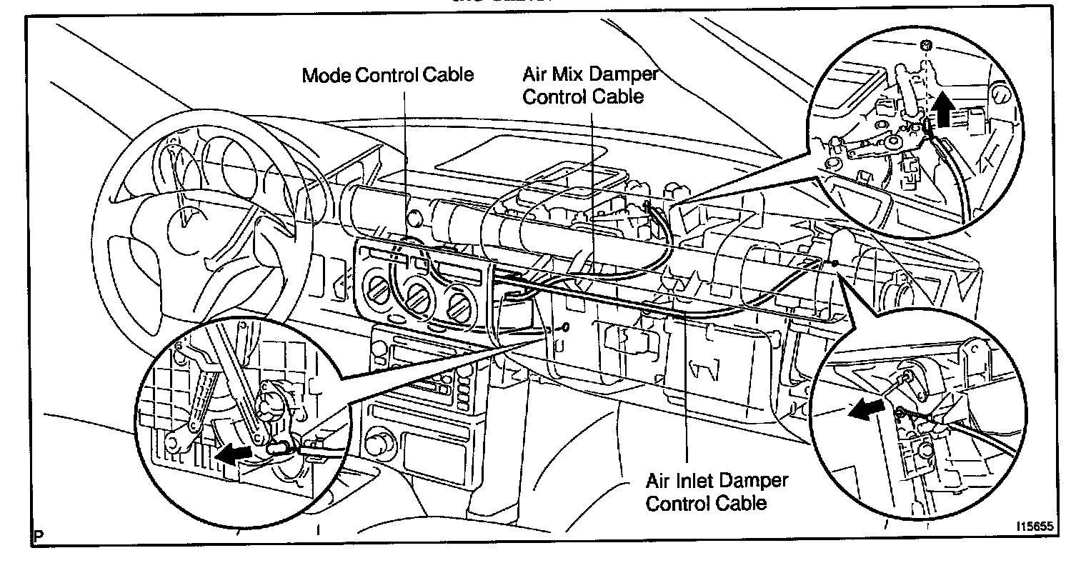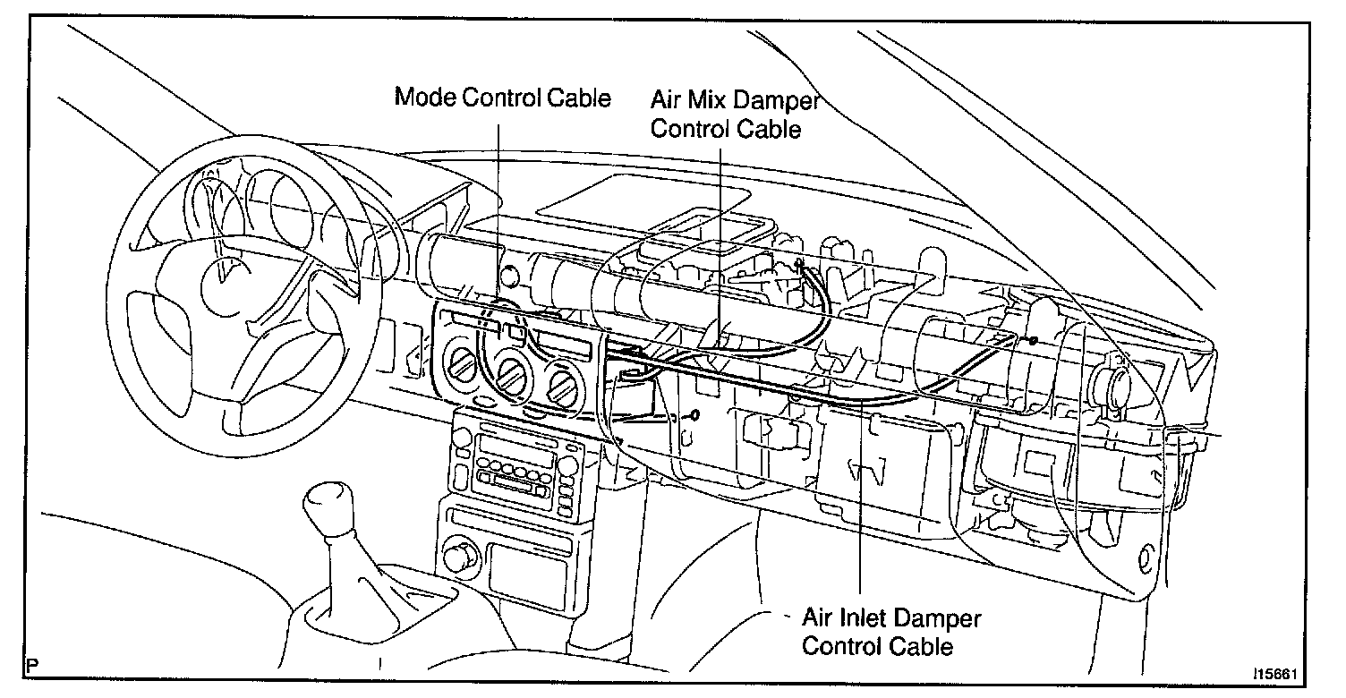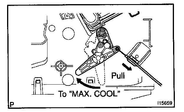 e. Adjust air mix damper control cable.Set the air mix damper control lever to "MAX. COOL" position and connect the inner cable to lever pin and clamp the outer cable.
