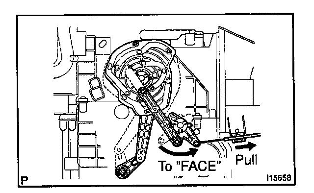 f. Adjust the mode control cable.Pull the air outlet damper control link to "FACE" position, connect the control cable and lock the clamp.