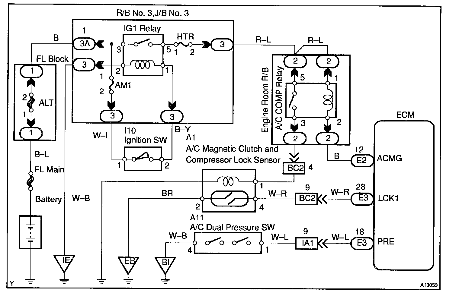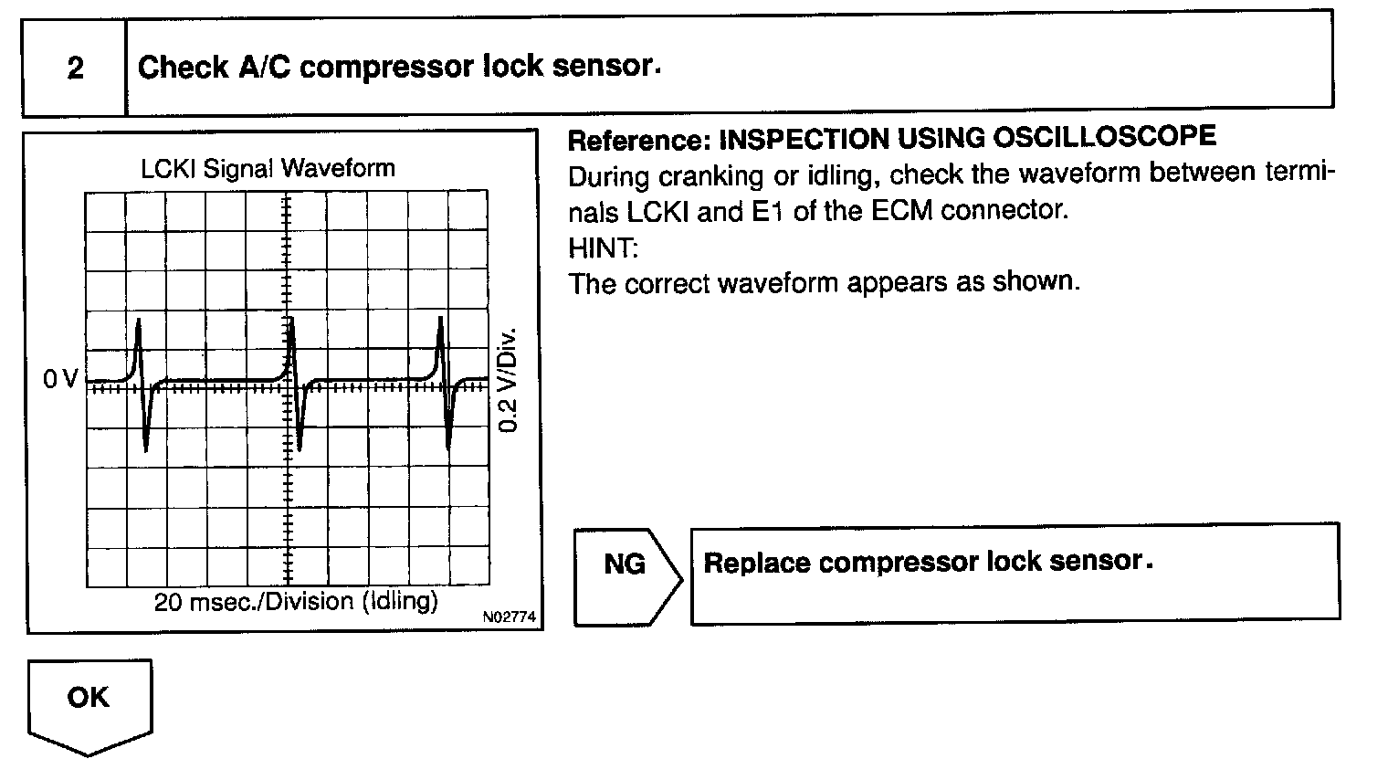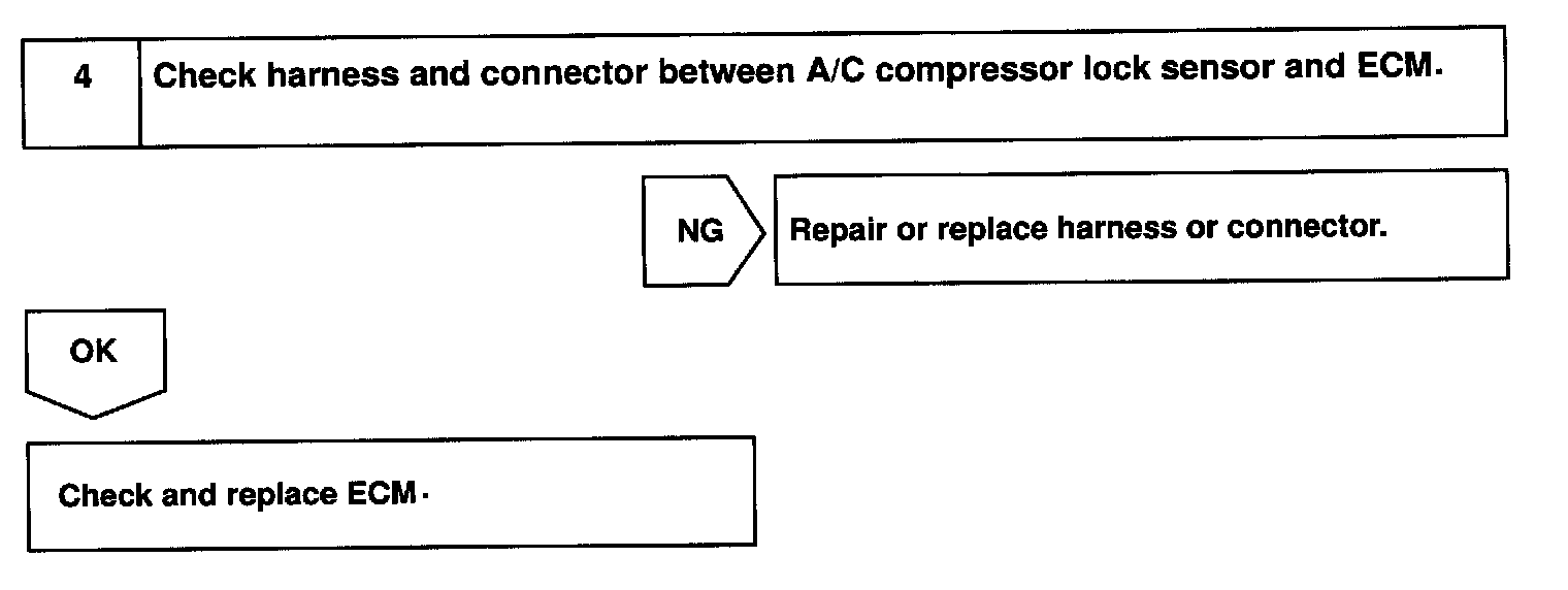 CIRCUIT DESCRIPTIONThis sensor sends 1 pulse par engine revolution to the ECM. If the number ratio of the compressor speed divided by the engine speed is smaller than a predetermined value, the ECM turns the compressor off. And, the indicator flashes at about 1 second interval.