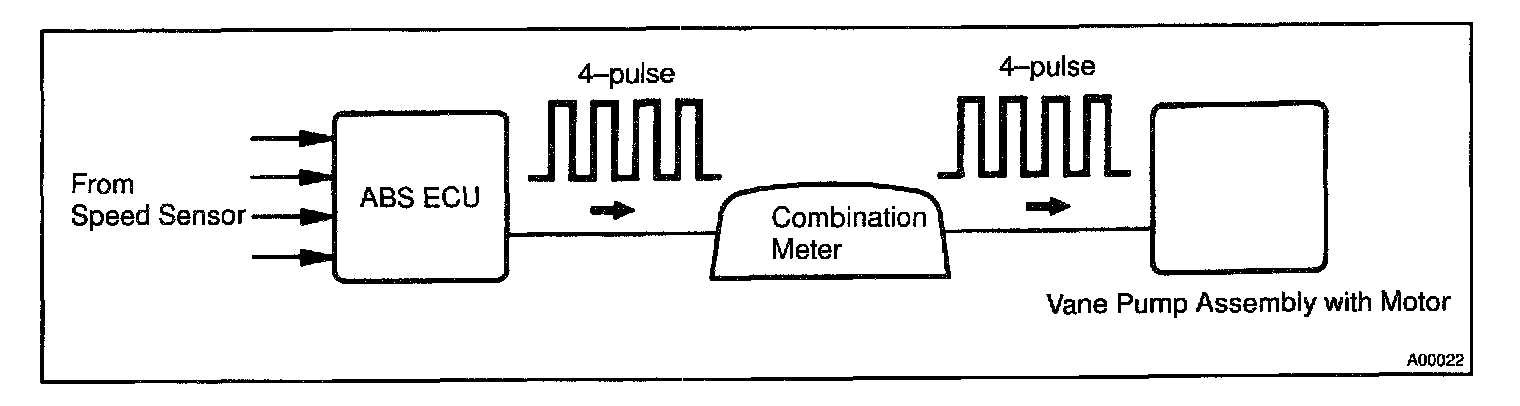 The speed sensor for ABS detects the wheel speed and sends the appropriate signals to the ABS ECU. The ECU converts these signals into a 4-pulse signal and outputs it to the combination meter. After this signal is converted into a more precise rectangular waveform by the waveform shaping circuit inside the combination meter, it is then transmitted to the vane pump assembly with motor. The vane pump assembly with motor determines the vehicle speed based on the frequency of these pulse signals.