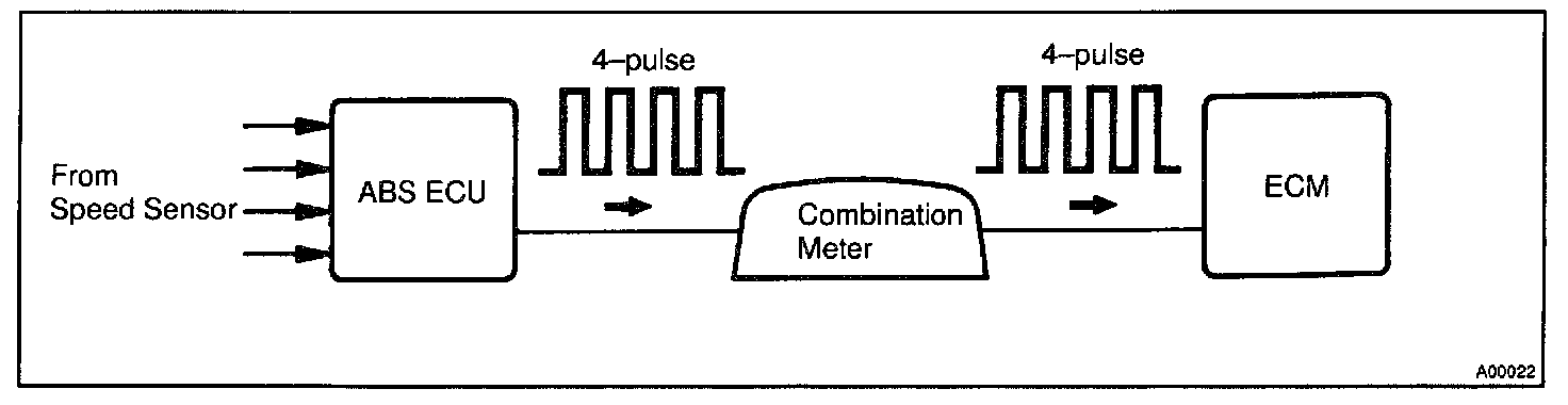 The speed sensor for ABS detects the wheel speed and sends the appropriate signals to the ABS ECU. The ECU converts these signals in to a 4-pulse signal and outputs it to the combination meter.