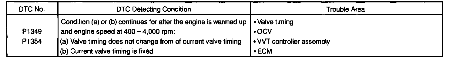 VVT system controls the intake valve timing to proper timing in response to driving condition. ECM controls Oil Control Valve (OCV) to make the intake valve timing properly, and, oil pressure controlled with OCV is supplied to the VVT controller, and then, VVT controller changes relative position between the camshaft and the crankshaft.