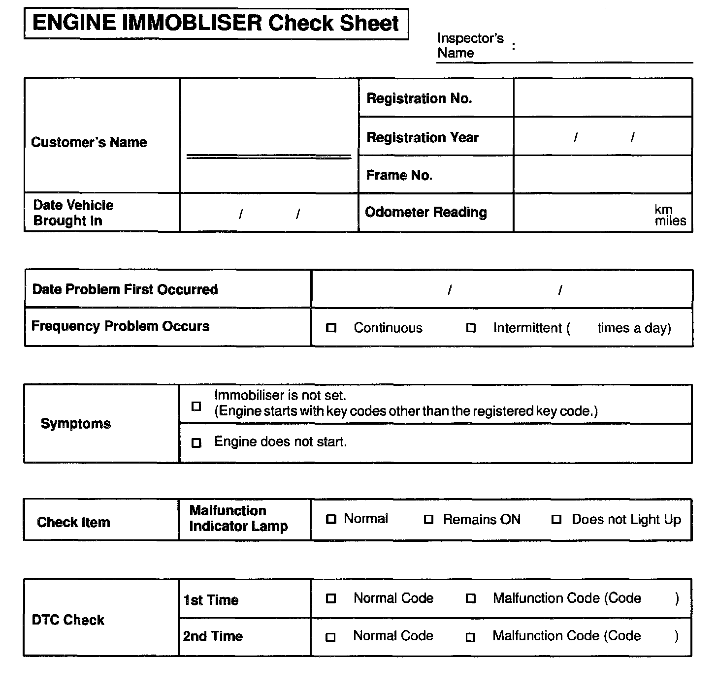 Engine Immobilizer Check Sheet: