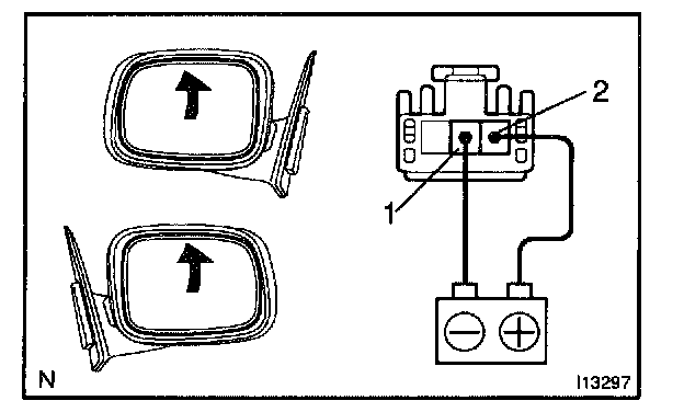 c. Connect the positive (+) lead from the battery to terminal 2 and the negative (-) lead to terminal 1, and check that the mirror turns upward.