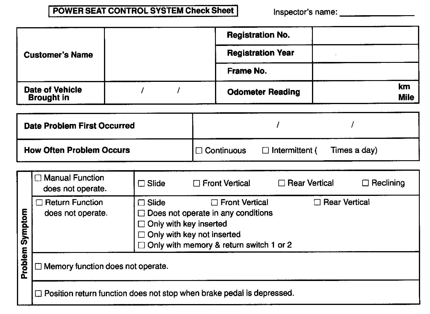 Power Seat Control System Check Sheet: