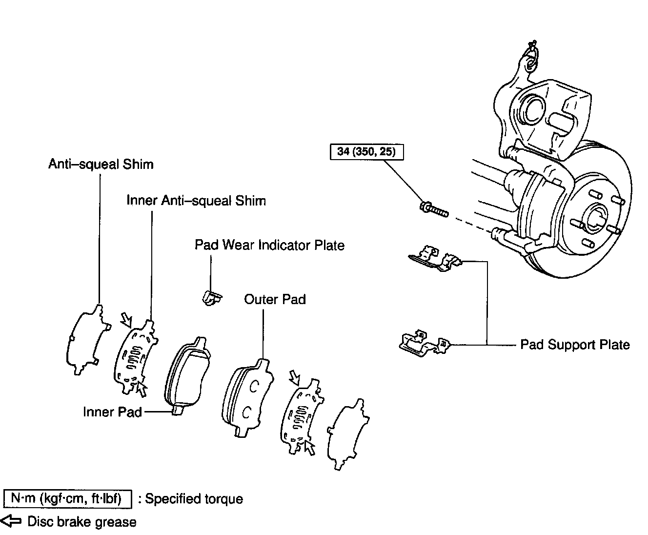 b. Apply disc brake grease to both sides of the inner anti-squeal shims.